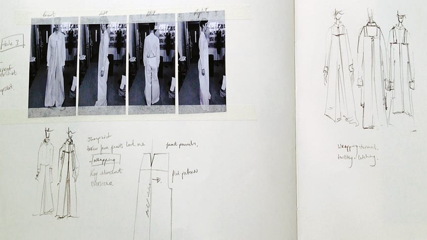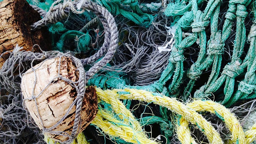 The use of waterproof fabrics for protection is offset through naturals cottons as well as the catching and wrapping of netting entangled with worn cork buoys. It is these elements combined that show the distress and powerlessness created by surrounding ominous oceans.