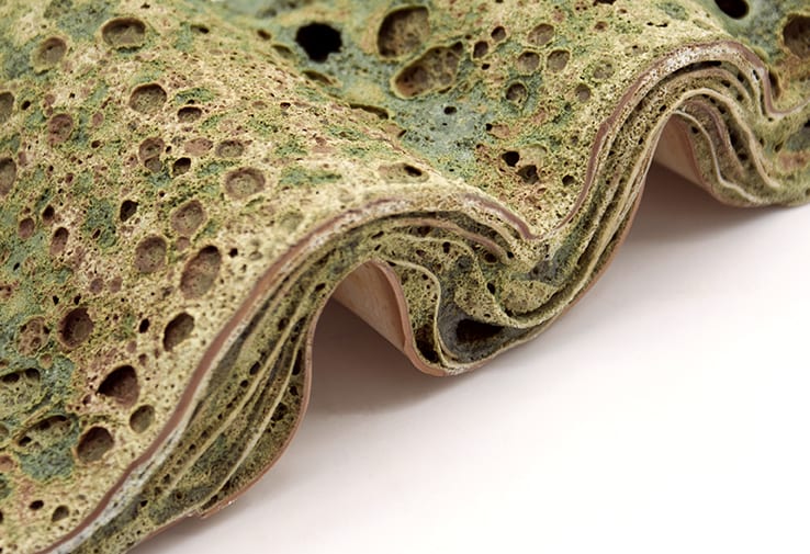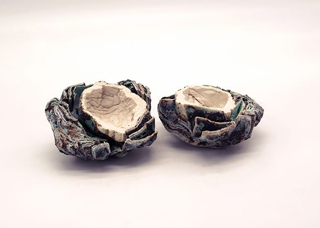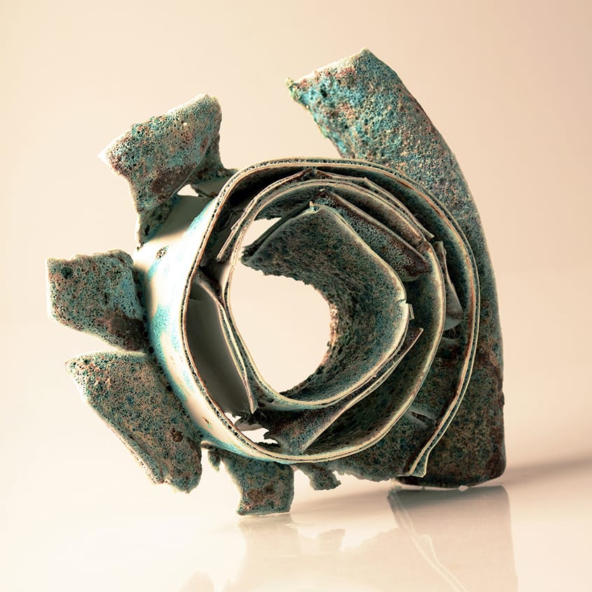 My work explores geology through the lens of time, or time through the lens of geology. It investigates the notion of capturing and accelerating time through ceramic processes. Ceramic construction methods and materials echo the brute natural forces intrinsic to the formation of geological strata and their subsequent breakdown and exposure through erosion – crushing, crashing, scorching, rupturing and shattering.