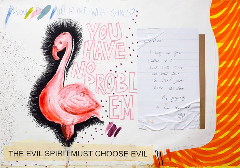 Nabla Furey undertakes a form of confessional art in her practice as she focuses on an internal revelation of the private self. Through treating the work as a sketchbook, she intimately analyses the artist, the artist’s subjects, the space around her as well as her experiences and emotions in a quick and carefree manner. As with her sketchbooks the artwork is never complete, and a sense of adaption is present as she reworks and adds layers constantly, which mirrors the change of individual and social activity in adjustment to cultural surroundings. Sexual identity, self-awareness, and the depiction of a young woman in an artistic community and the challenges that’s present themselves are but some, of the underlying key themes. Furey adopts a bright, vibrant colour palette and an array of mixed media to create individual singular pieces that can also work collectively as an installation portraying an energetic personal narrative.