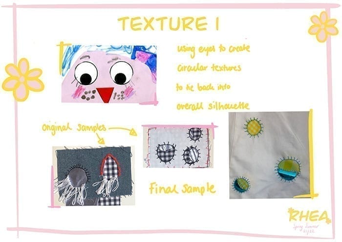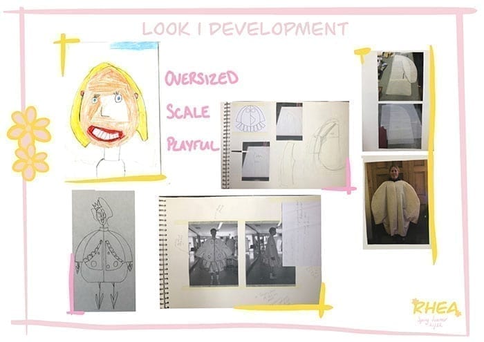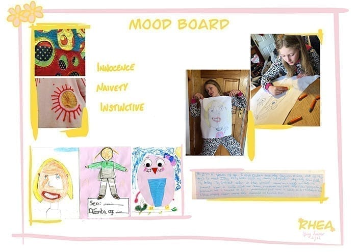 My little sister Rhea is a very imaginative and eccentric little girl whose levels of imagination and creativity have always inspired and interested me. My collection is based around a series of her drawings. These drawings have influenced both the silhouette and overall aesthetic of my collection.