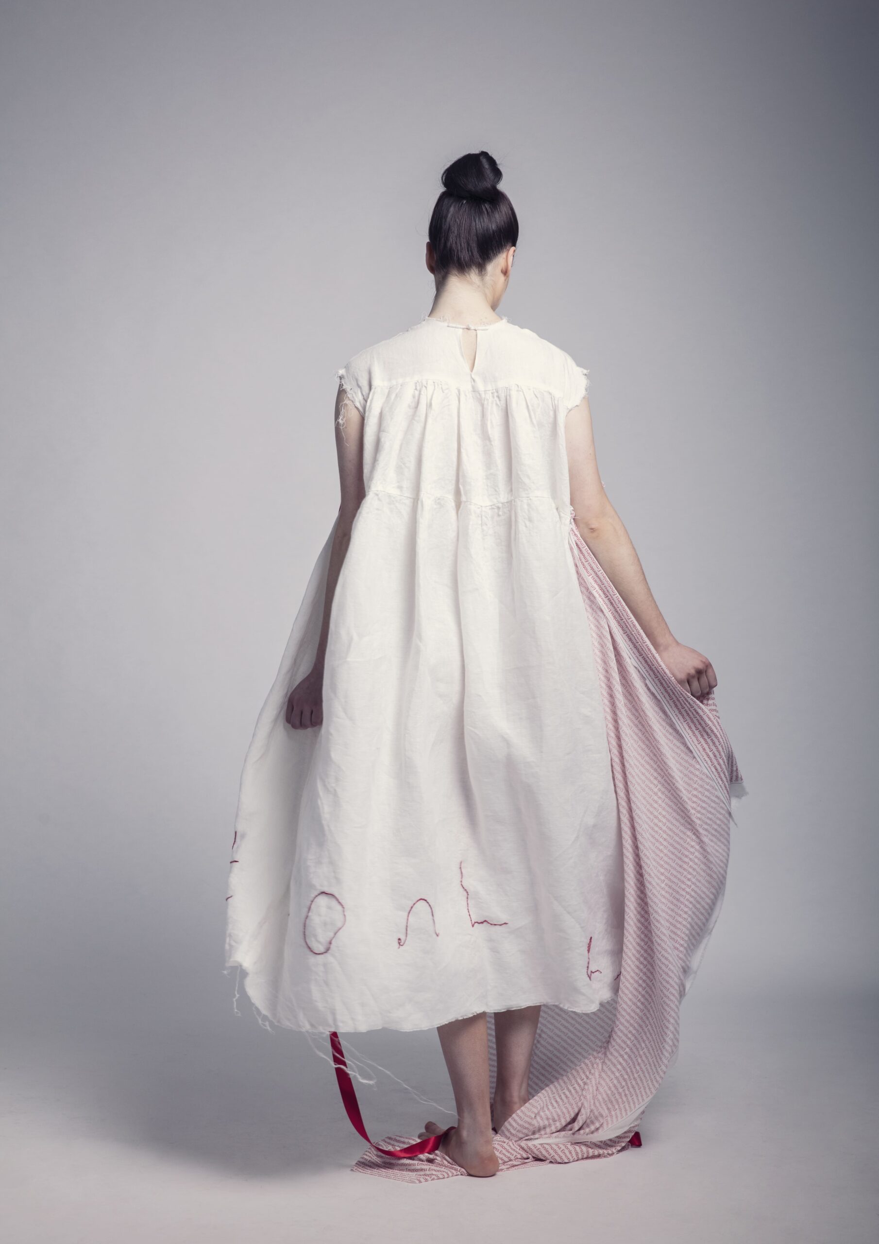 Delicate pinks and rich bodily reds throughout the collection resemble the fleshy skin tones and blood within our bodies, as is metaphorically used throughout look 1 to 6. I created each individual print digitally from concept to really connect back to the poem, each piece of fabric used in this 6-piece collection represents the power of women, anguish, emotion and the human form. The layering of tulle reflects the concealed effects that the body endures throughout the abuse. The gathering and frills represent the tensions of what was undergoing behind this poem, the push and pull. The collection brings all the underlying suffering, pain, thoughts and emotions to the surface, so that it should no longer remain hidden.