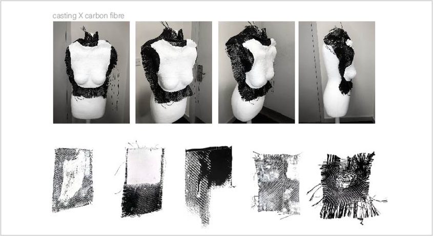 The use of casting bandage and carbon fibre reflect the construction of the orthotic boots I wore throughout my childhood which are used in the treatment of cerebral palsy. These boots act in a paradoxical way creating mobility by forcing constraint, by stretching out the hyper tensed muscles caused by the condition. The use of these materials in both their solid, moulded forms and malleable cloth state, reflects this conflict.
