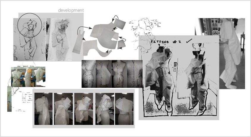 I reused the Velcro straps and buckles from my collection of these boots, as closure details on my garments, to bring to whole journey from my original source to inspired design, full circle. I took my shape and silhouette inspiration from my own medical gait analysis videos and translated the movement of my walking into my pieces. I wanted to channel these static movements, into something artistic, challenging my own relationship with my view of the disability.
