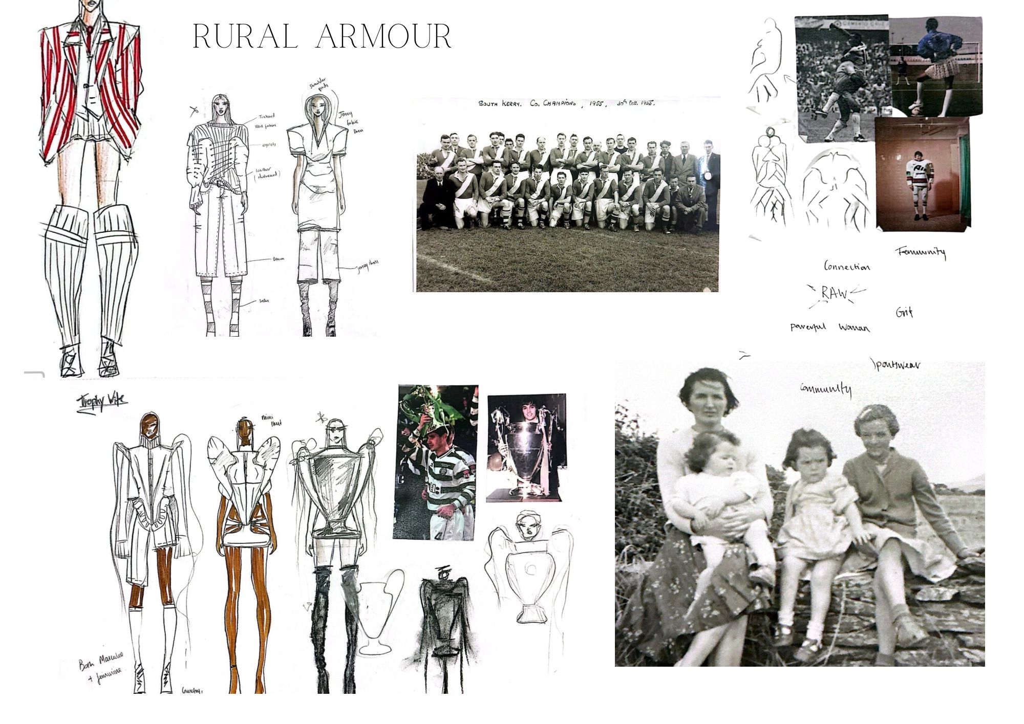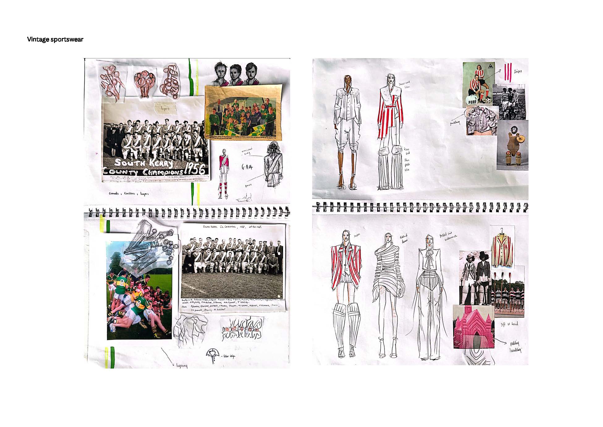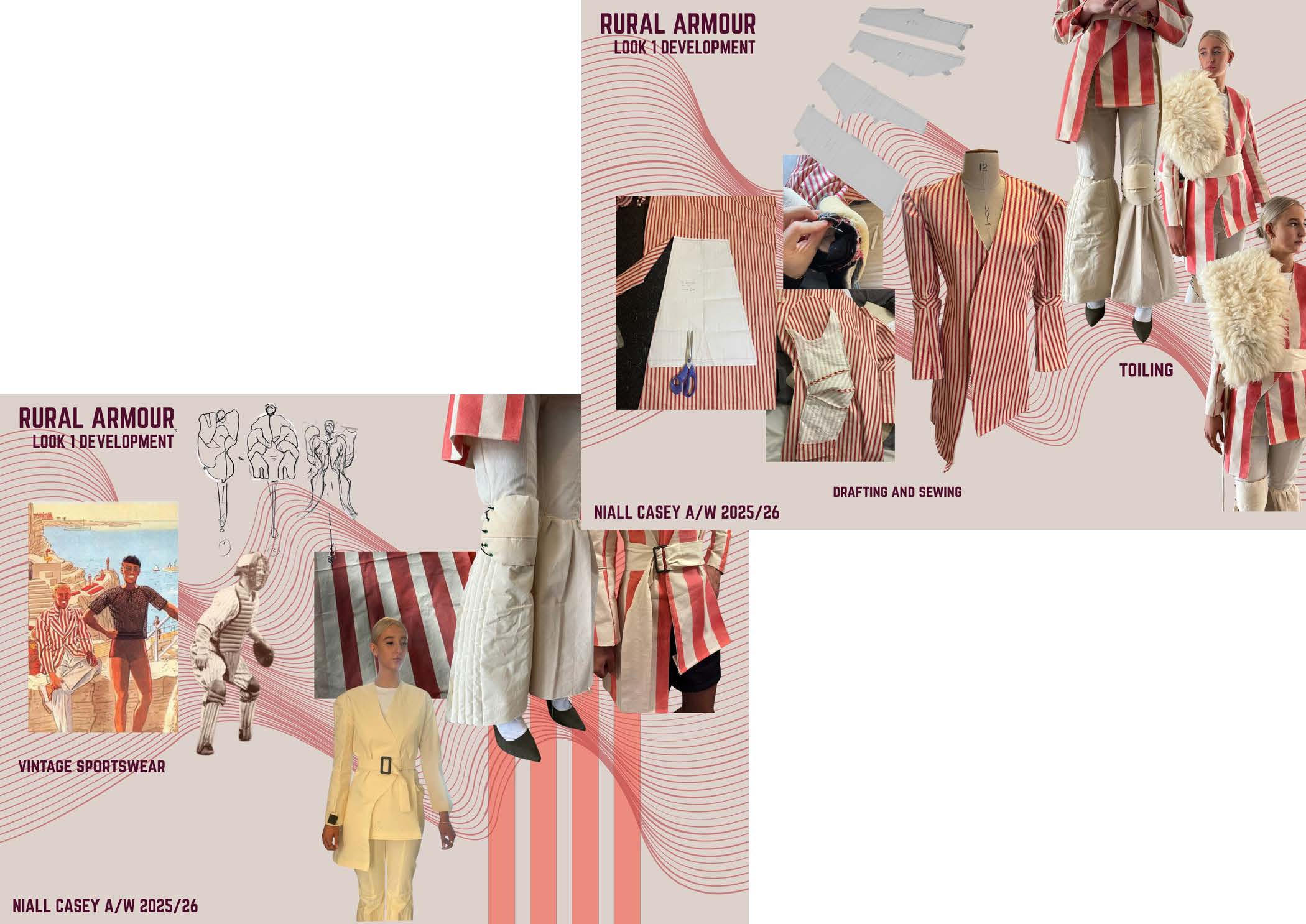 This collection blends the ideas of fighting with my own femininity and adhering to masculine norms. It shows how clothing can be both a shield and a statement, blending the ruggedness of traditional Irish workwear and sportswear with elements of restriction, concealment and defiance. I used mostly red cotton ticking stripe – a fabric traditionally associated with workwear, durability, and domestic spaces. Its rigid structure and repetitive lines mirror the constraints of rural masculinity and nods to vintage sportswear. The silhouettes blend the ideas of utilitarian workwear with elements of restriction, defiance and self expression.