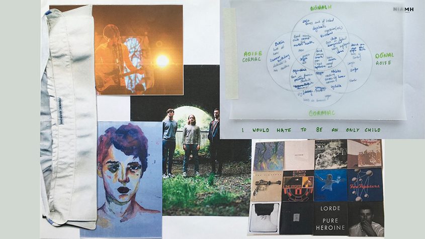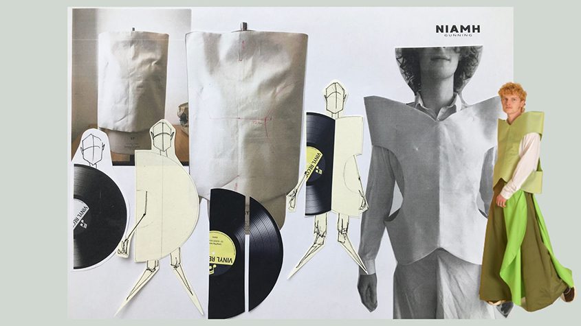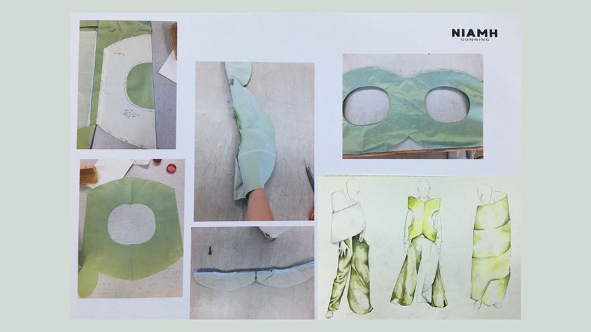 My collection, entitled “Gunning” is inspired by my three siblings, Donal, Aoife and Cormac.  Having spent the last year all living in different places, I wanted to highlight what make us different, and, what ties us together.  I started by choosing shapes for each sibling that represented their interests and personalities, then responded to these shapes through experimental collaging and stand work.  Following this, through pattern cutting and toiling, I  developed garments for both men and women, each look focusing on one of my siblings.  In terms of fabric and colour, I decided on different shades of green, as we all have green eyes.  In the process of designing and constructing my collection I developed a new sense of understanding and compassion for Donal, Aoife and Cormac.  It gradually became less of a representation of my siblings but a way to show my love and appreciation for each of them.