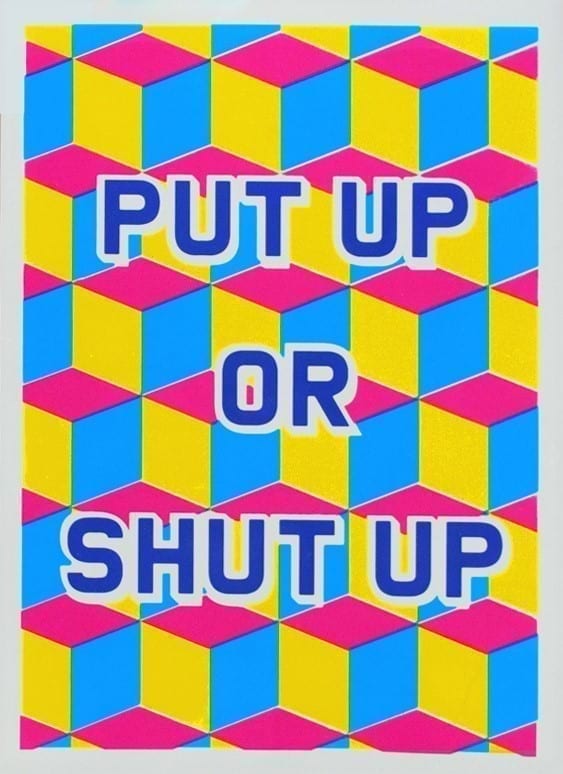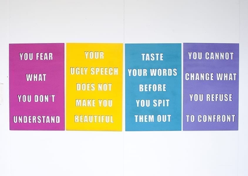 I use text as the main subject matter in many of my works in order to confront the viewer with subversive phrases and affirmations, inviting them to respond to the artwork. These works are informed by studying methods of détournement, subversion and semiotics – particularly the use of codes and signs. The fonts and colours I choose for each word and block of text are all relevant and it is important that they maintain an aesthetic flow for the viewer whilst also connoting ideas of gender and sexuality.