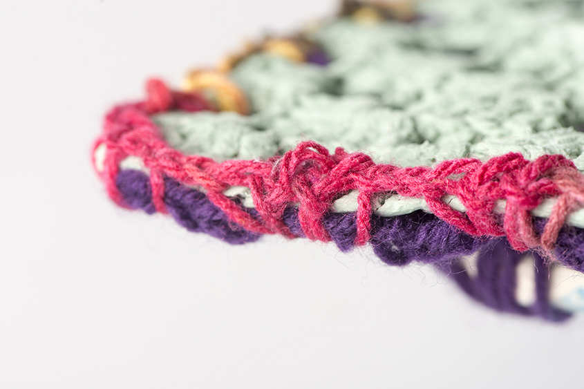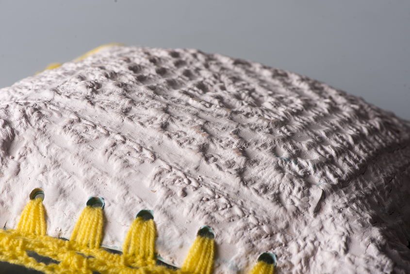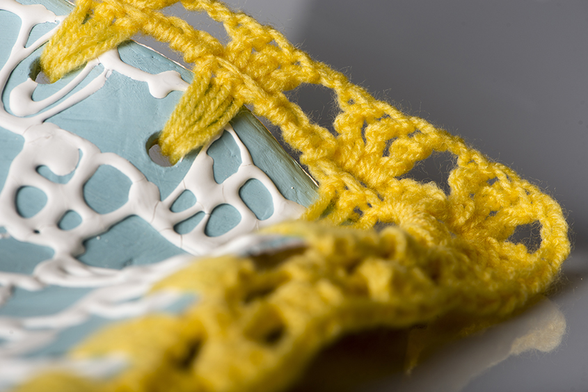 My work endeavours to create a seamless interplay between the mediums of textiles and ceramics. My own experience of making handmade crochet blankets created a starting point. Each blanket is constructed from many small pieces using the ‘granny square’ pattern. Multiple squares, clashing colours, patching and the aesthetic of seam joining associated with this blanket making are qualities I investigate through ceramics. The sense of comfort derived from crochet blankets act as a grounding point for my ceramic work. The resulting forms are my transitional objects, a psychological reminder of the comfort the very act of crochet gives me. I am enveloped.