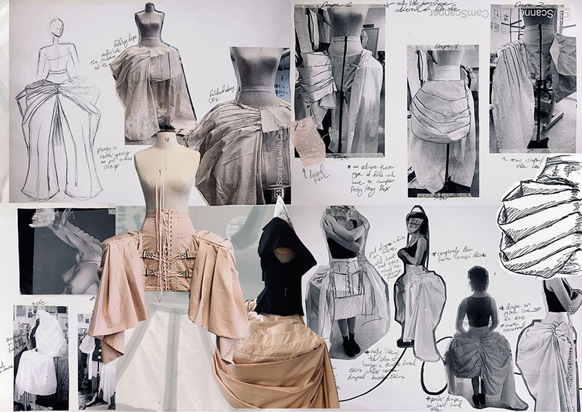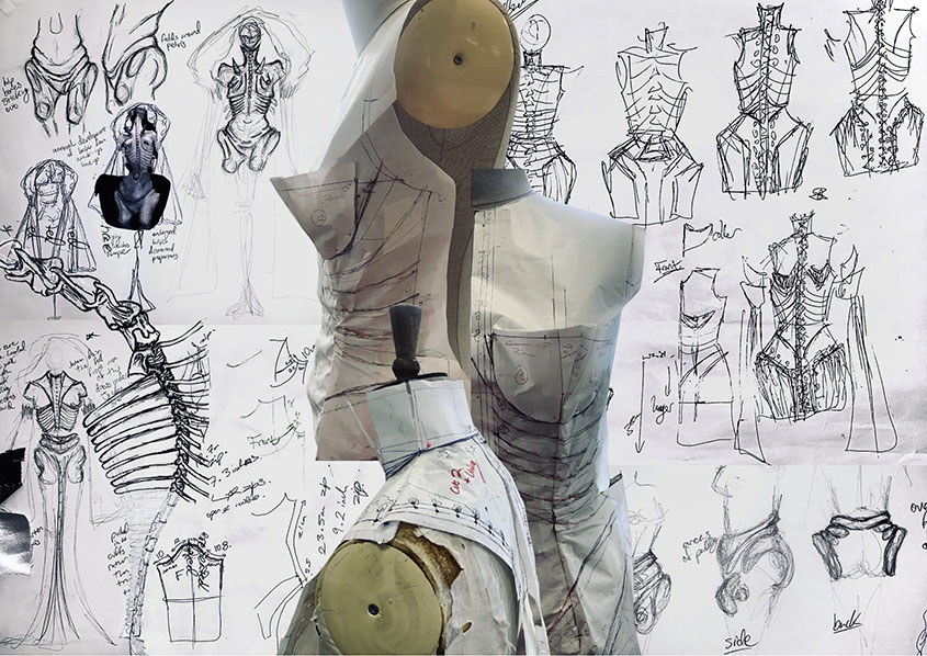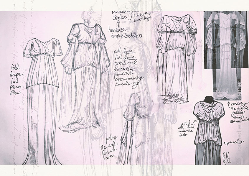 This Collection responds to the experience of performing femininity and the societal pressure to be a forever young and consumable woman. As a child, Nicole navigated her gender expression through a heteronormative lens. She identified the triple Pagan goddess the Maiden, Mother and Crone as an idealized symbol of femininity, a mirror of how her own femininity should look throughout her life – a virginal maiden , a nurturing mother and a wise crone. Embracing her lesbian identity reshaped Nicole’s understanding of her feminiety, rejecting the preformance of a delicately traditional and infantilized version in favor of a more empowered and sensual expression. Becoming the promiscuous lusting maiden rather than preforming the virginal one. The Divine, The Femme, The Dyke, embodies a femineity that is unrestricted, divinely transgressive and deeply erotic. Taking inspiration from a 1520 etching named Lo Stregozzo (the Carcass) by Agostino Veneziano, the garments in this collection reflect the journey of the triple goddess to the sabbath on a twisted carcass. Drawing on the contorting figures in the etching as well as sculpture Succubus Demon by Naemi Smith, the structured silhouettes and flowing drapery, influenced by the triple goddess, weave a narrative throughout the collection, striking a harmonious balance between constraint and liberation. The color palette is flesh-toned, oozing, and somber: Gentle pink, crimson red, and the deepest black, resembling blood. The red hues holds special symbolism, embodying the first blood, the bleed of afterbirth and the last bleed. In this sense, the color scheme adopts a persona and mirrors the archetype of the Maiden, Mother, and Crone.