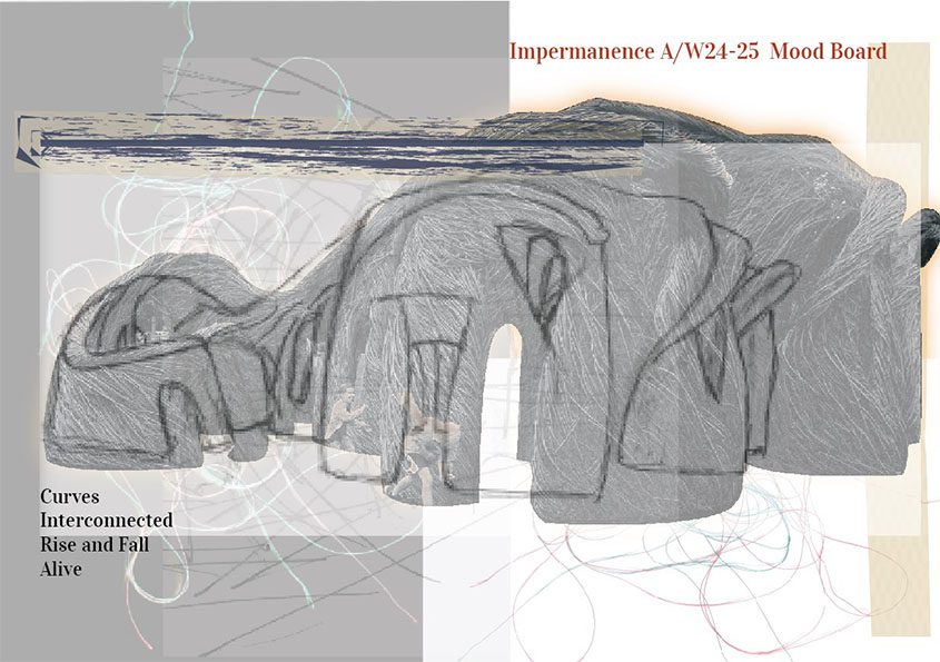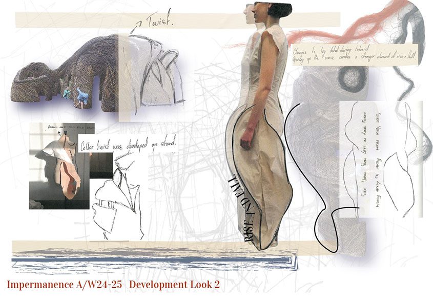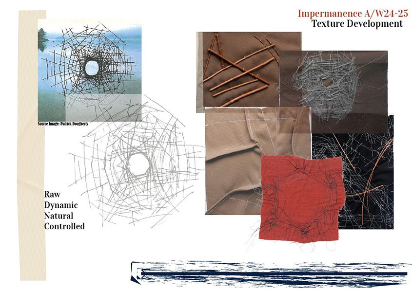 A flower is no less beautiful just because it dies, the great love is not less than just because it ends. This collection acts as an embodiment of life, energy and celebration. Nature artists who explore similar themes of ephemeral art acted as secondary sources for this collection. The sculptural curves and wrapping elements of the collection were inspired by willow sculptures created by Patrick Dougherty. The fleeting beauty of the sun setting on the ocean is captured through the colours while the texture captures energy and life and focused on an ephemeral art piece by Andy Goldsworthy to guide me towards this raw energy. Using biodegradable fabrics of deadstock wool, linen and culpro lining has created a natural collection which will eventually break down and continue its new role in the circle of life. Nothing is supposed to last forever, not even this collection.