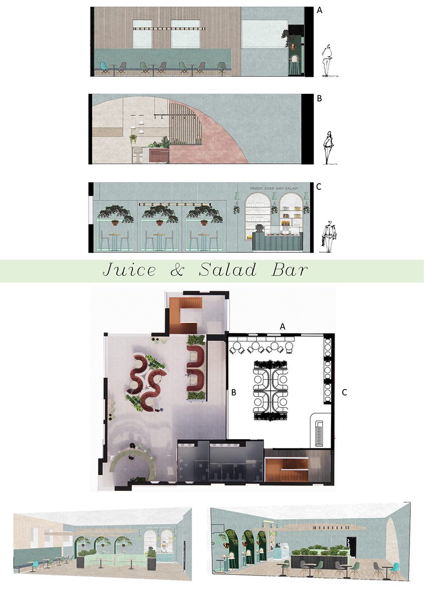 design by incorporating curves throughout each space and dedicating one colour of the grape to each