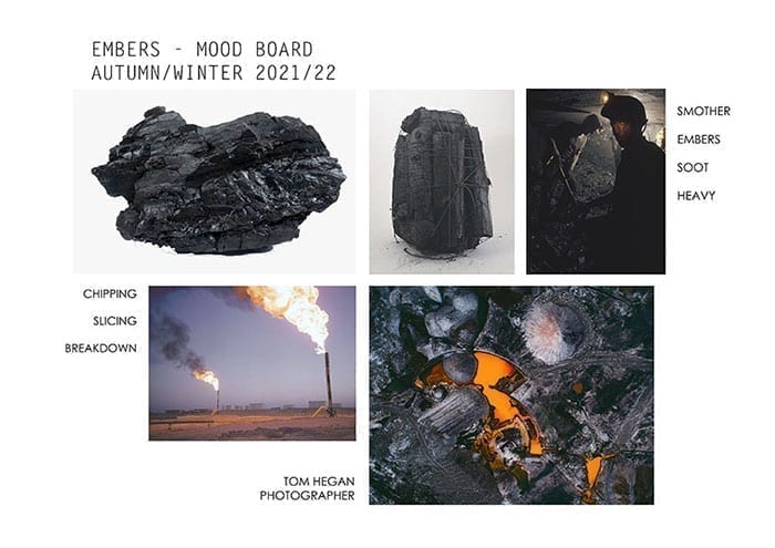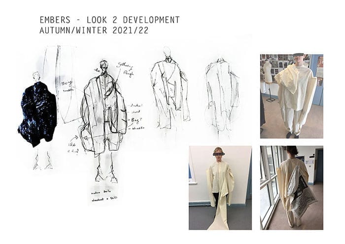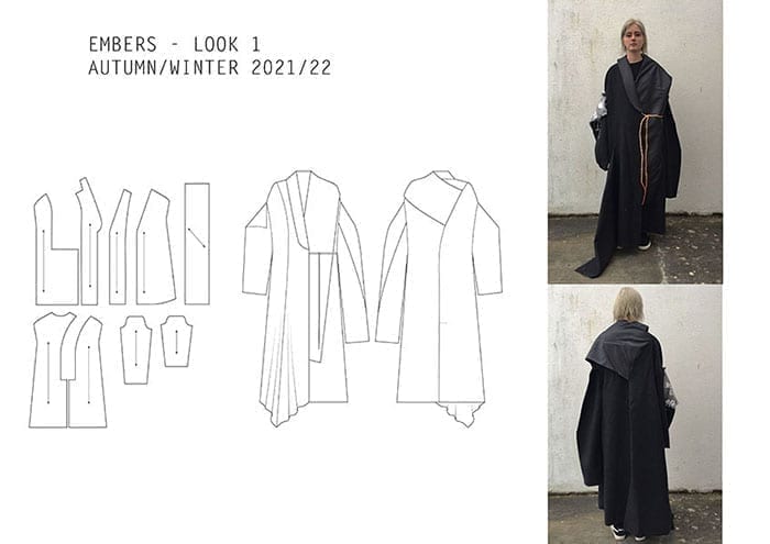 The concept of my collection developed from a series of aerial photographs by the photographer Tom Hegan. The images are of coal mines in Germany and the damage caused to the land as a result. Coal mining has swallowed nearly half a million acres of Germany’s land – including villages, forests, and roads. The ideas of mining and burning coal lead to the development of technical samples, burning fabrics, and exploring alternative fabrics, such as recycled coal bags. I designed my collection to show the process of coal burning and breaking down by focusing on heat damage and developing large panels on the body to create a slice affect. The collection is unisex with an oversized, relaxed tailored silhouette.