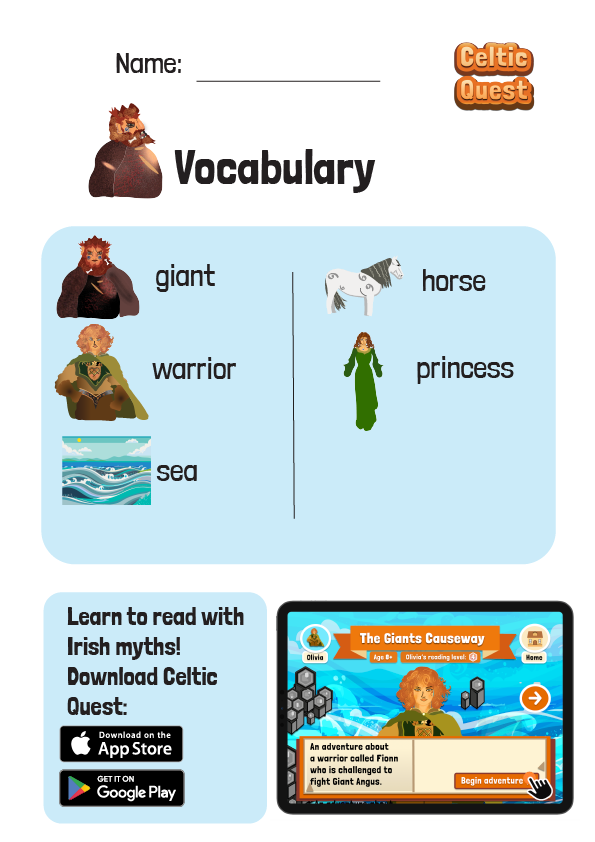Celtic Quest combines voice-over narration with animated text to support young readers, particularly those who struggle with reading. The voice-over includes a variety of Irish, Scottish and English accents, ensuring that children not only learn accurate pronunciation but also experience a sense of cultural immersion. This unique feature distinguishes Celtic Quest from other reading apps, making it a powerful tool for enhancing language skills. There is background music, sound effects of waves, and an angry Giant who likes to roar!