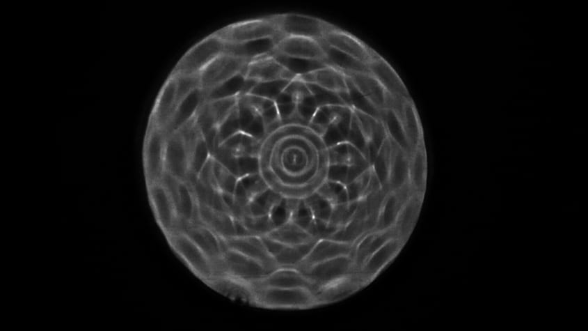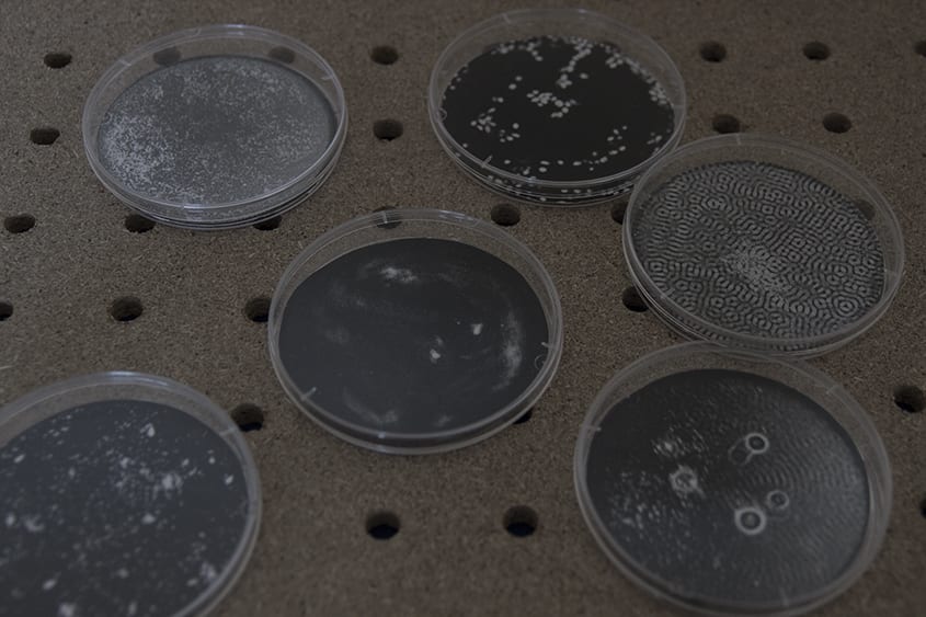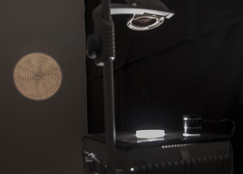 99.9999999999999% consists of two overhead projectors, two random tone generators (created in Pure Data application) and approximately 100 petri dish sized photograms, all housed in an inside out garden shed. Salt and water are resonated in petri dishes with vibration speakers suggesting notions of atoms and the basic building blocks of life. These chaotic and random projections are reflected back, to create an immersive and common space in which the work is experienced, suggesting that you are inside yourself, full of atoms and vibrations. In the shed, there is an illuminated shelving unit filled with petri dishes, each framing an ongoing experiment with photograms, symbolising fundamental similarities in methodology between art and science.