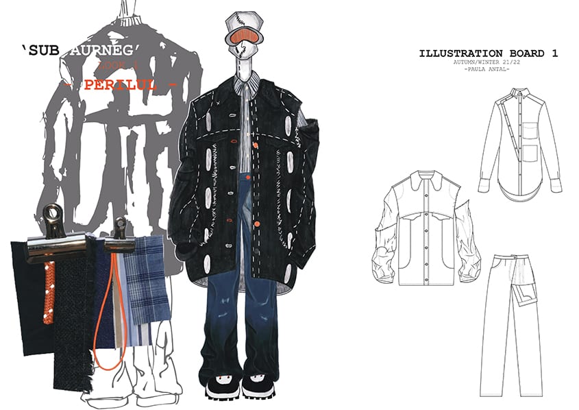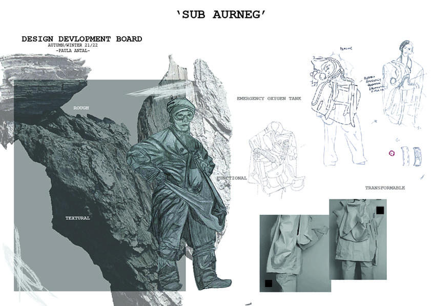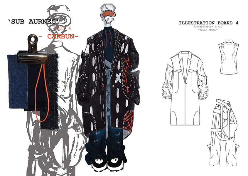 ‘Sub Aurneg’ is a collection visually clear only to those born in a post-communist environment of eastern Europe. Where people were bound within a territory with a poor quality of life and adapting was necessary. As such garments in this collection need to adapt to their environment surrounding the mining ecosystem and the pit itself. The combination of work clothes and denim highlights a much needed versatility. The slouchy aspect is created out of necessity for comfortability and accessibility.