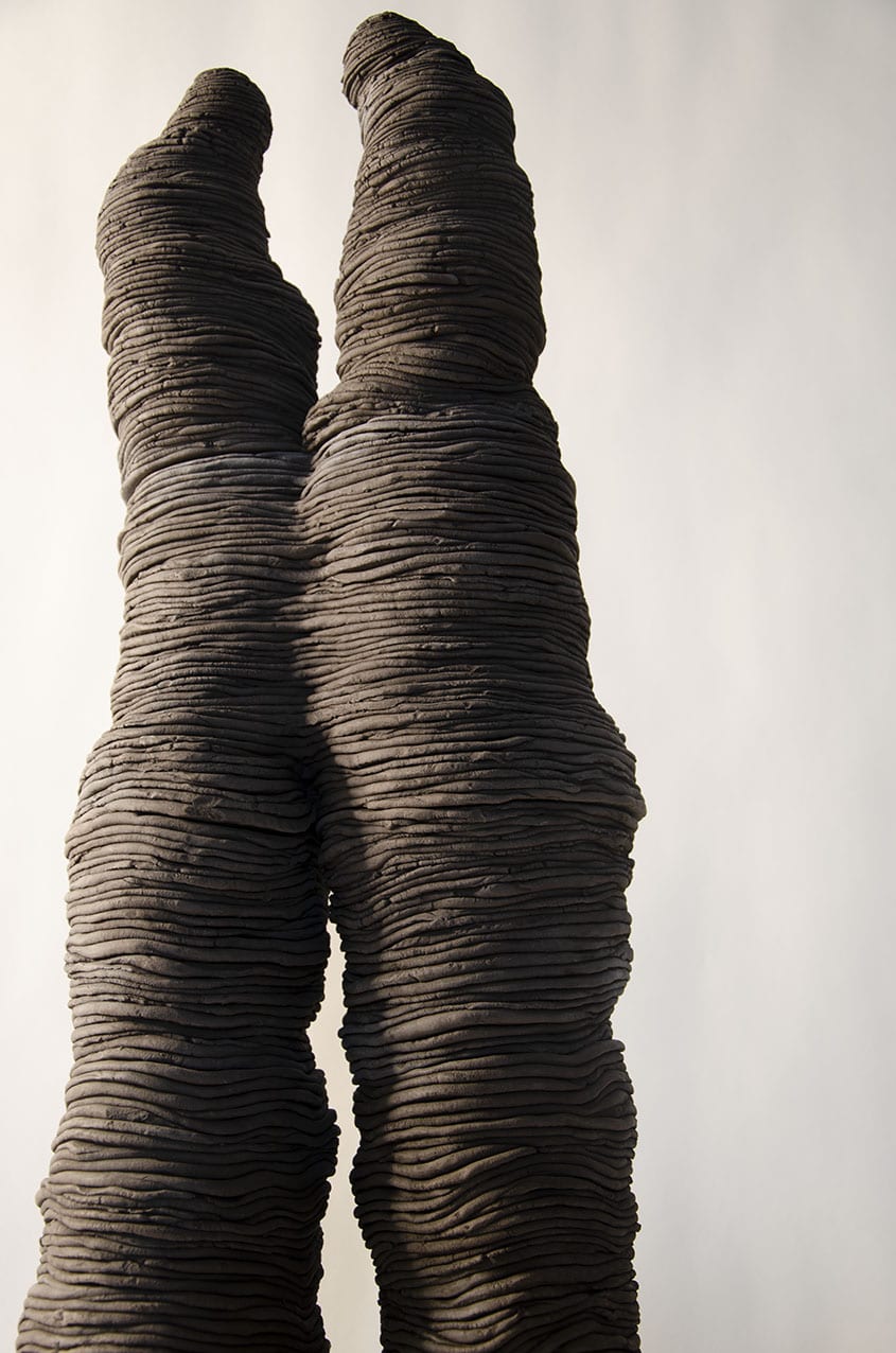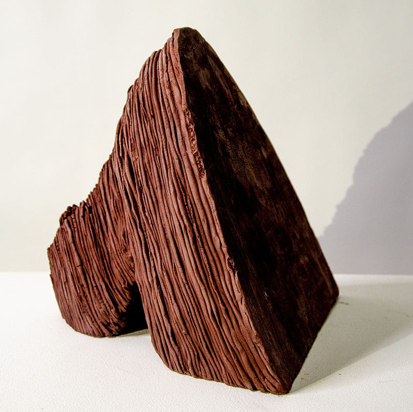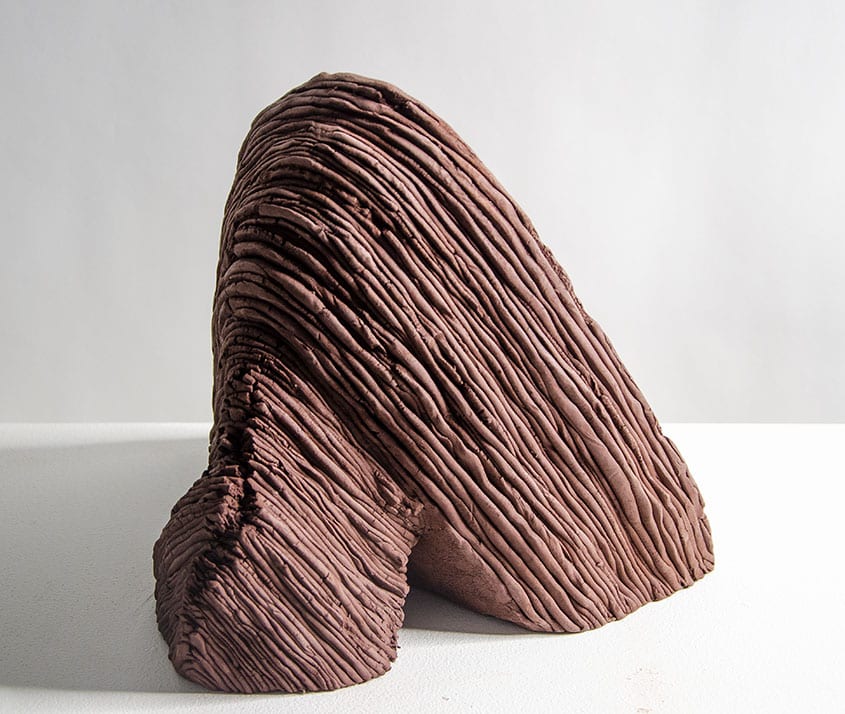 My work focuses not on the overwhelming scale of the landscape, but on its composition – honing in on sedimentary rocks, resulting from the layering of sediments over time. Dynamic inertia of pressure, weight and compression created linear and sponge-like features, both visual and textural. These activities froze in rock and over time, through erosion, created a magical but harsh place. I explore these features by creating sculptural forms where ceramic material and process examine the “laying” and compression of the rock formation process. Rather than make scale copies of the cliffs, mirroring shapes and lines exactly as seen, I create abstract sculptural forms that are visually and materially linked to geological processes and reference the impressive scale of this place.