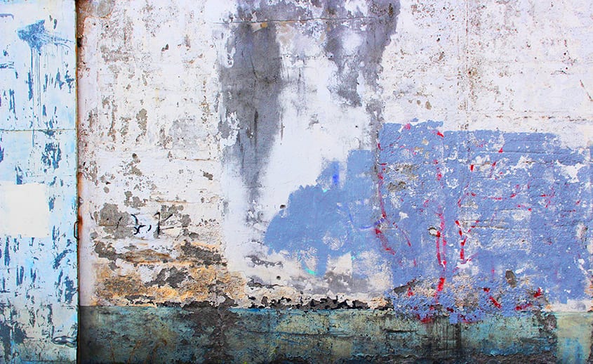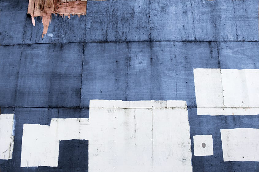 Many desolate spaces around the city feature curious surfaces and textures. These decaying surfaces reflect the passage of human culture and the passage of time. Paint is used to mask marks of graffiti or weathering on walls and other surfaces. Often the shapes and colours of these cover-ups have collage-like elements; such as plains of colour, shapes and materials. There is a painterly quality to these spaces.