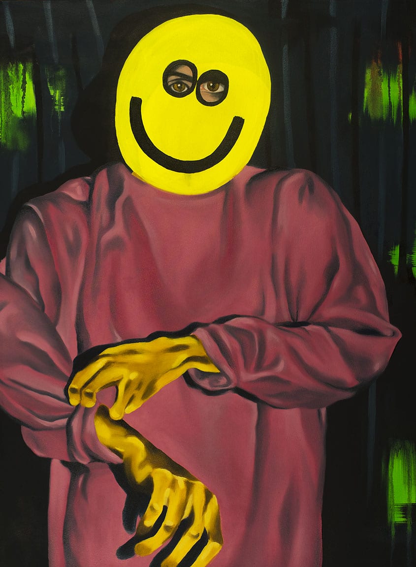 Through portraiture and figurative painting, Rachel’s work explores the concepts of youth, friendship and the culture that surrounds them. By interacting and connecting with the generation of youth today, a series of paintings are developed. The iconic image of the smiley face, which has been around since the 1960s is powerful in its simple appearance. The image has often been associated with youth and has been used as a symbol of rave culture and various fashion statements. Now in our generation of youth today the smiley face is used as an emoticon to communicate through social media.