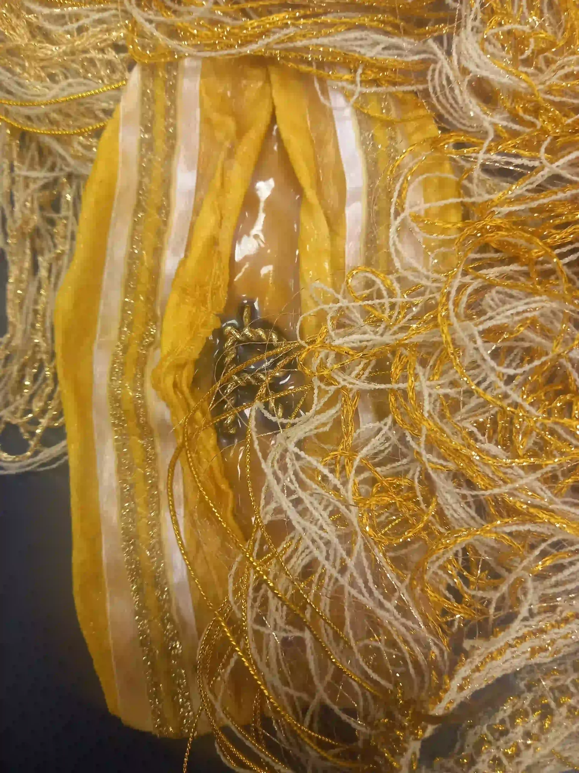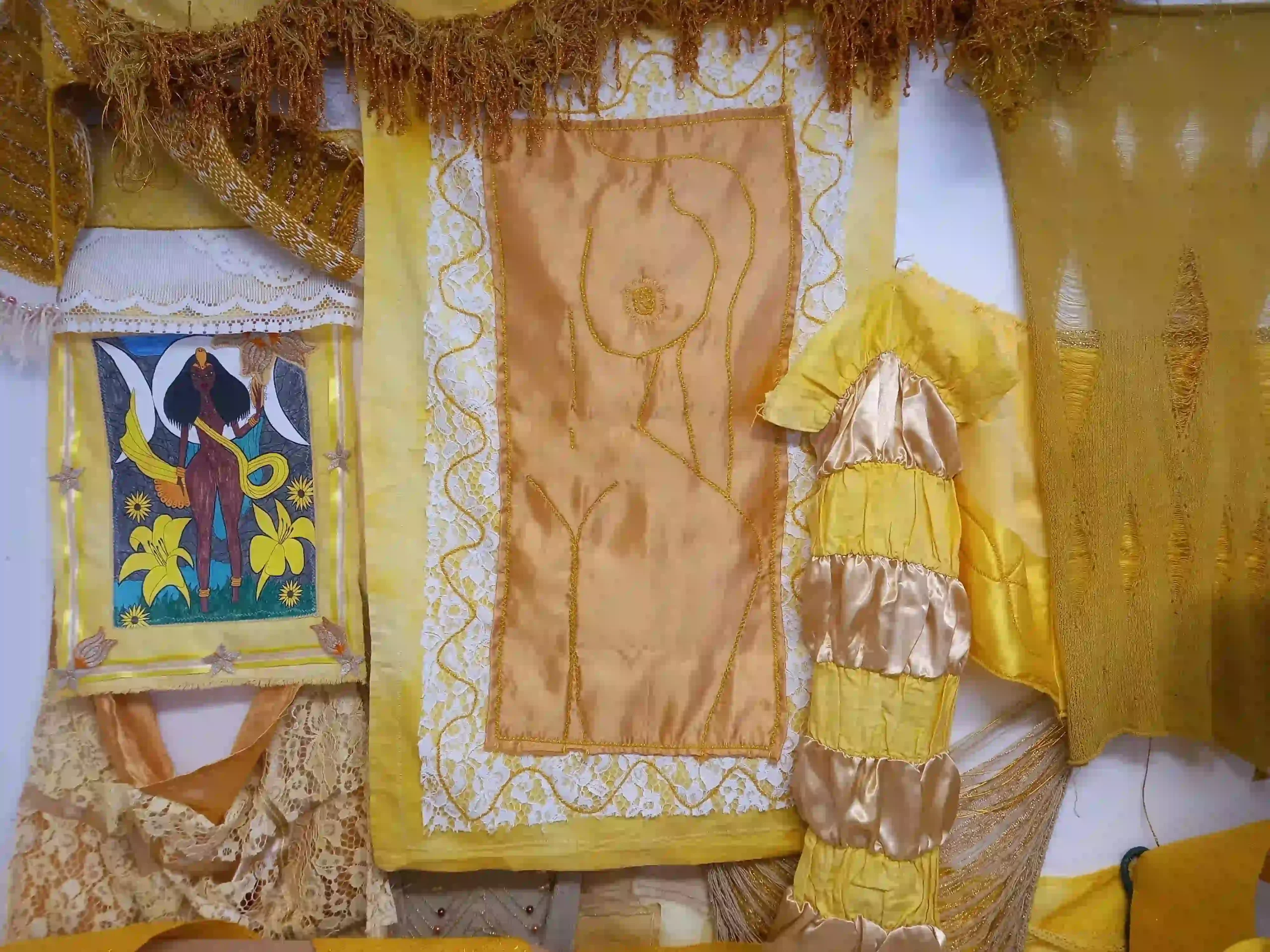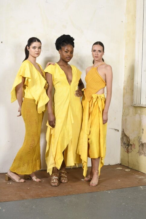 “The Many Faces of Oshun” is a collection that reflects Oshun’s multifaceted nature and the various ways she is worshipped in different cultures. Each look represents a different aspect of Oshun’s persona. Gauzy turmeric-dyed knits represent Oshun’s sexual nature, while the couched linen represents her as a motherly figure and a protector of children. Mustard and gold weaves are a throwback to Oshun’s West African heritage, while cotton textured knits reflect how Oshun continues to thrive in contemporary Afro-Caribbean diasporic traditions. My decision to also incorporate latex into my textiles was influenced by female wetness and pleasure, along with Oshun’s association with rivers and freshwater.