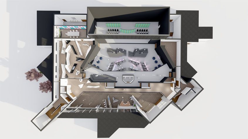 The initial inspiration for this design was taken from a historic sword, drawing upon the two opposing materials of leather and metal. From this starting point a materials pallet and clear separation of light and dark spaces grew. The areas representing the blade became the dark spaces, creating a sharp and harsh environment, while the natural feel of the leather is carried through to recreational space which consists of a cafe, mobile gaming spots and an indoor picnic area.