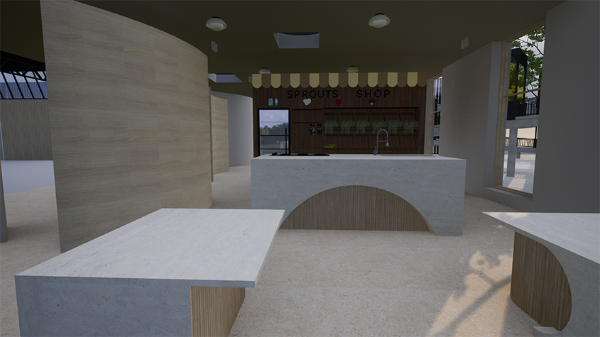 “Sprouts Creche” follows the Montessori approach, prioritizing children’s interests, and independence over traditional teaching methods. It promotes learning within a nurturing environment that respects children’s innate curiosity and desire to learn. The design proposal caters for children from age 6 months to 5 years, it employs a bead maze concept to encourage exploration through planting and cooking activities. The design includes greenhouses and outdoor spaces for hands-on experiences in growing, harvesting, and a kitchen for cooking fruits and vegetables. The design envisions an inhabited roofscape which offers diverse physical activities, while ground floor play areas incorporate natural elements like grass, sand, and wood. Through vibrant colors and engaging activities, the creche aims to teach children about colors, numbers, shapes, and the value of nutritious food. Located in a former secondary school building in Ennistymon, County Clare, the creche’s aesthetic blends earthy tones and natural materials, drawing inspiration from the surrounding landscape with dominant hues of green, orange, and yellow.