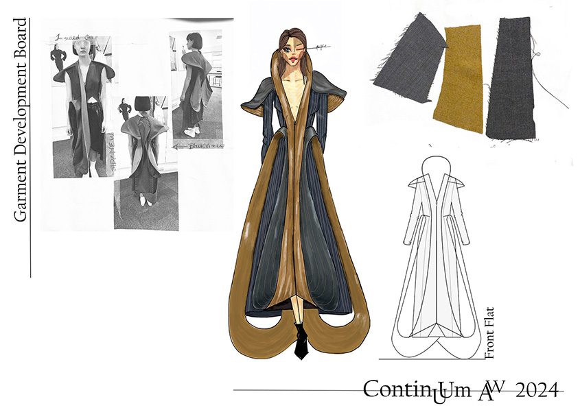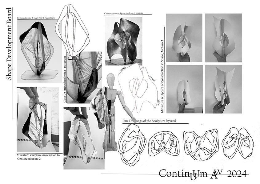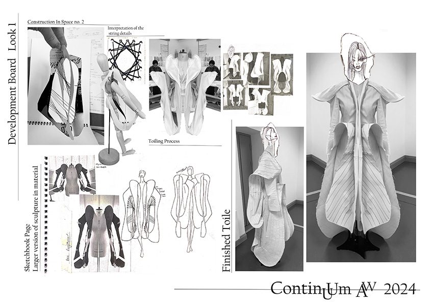 Continuum is an Autumn Winter collection inspired by the works of Constructivist sculptor Naum Gabo. The sculptures of Gabo serve as a representation of the fourth dimension using string to represent time as movement. This collection is based on the breakdown and study of these sculptures serving as its own visual interpretation of the fourth dimension.