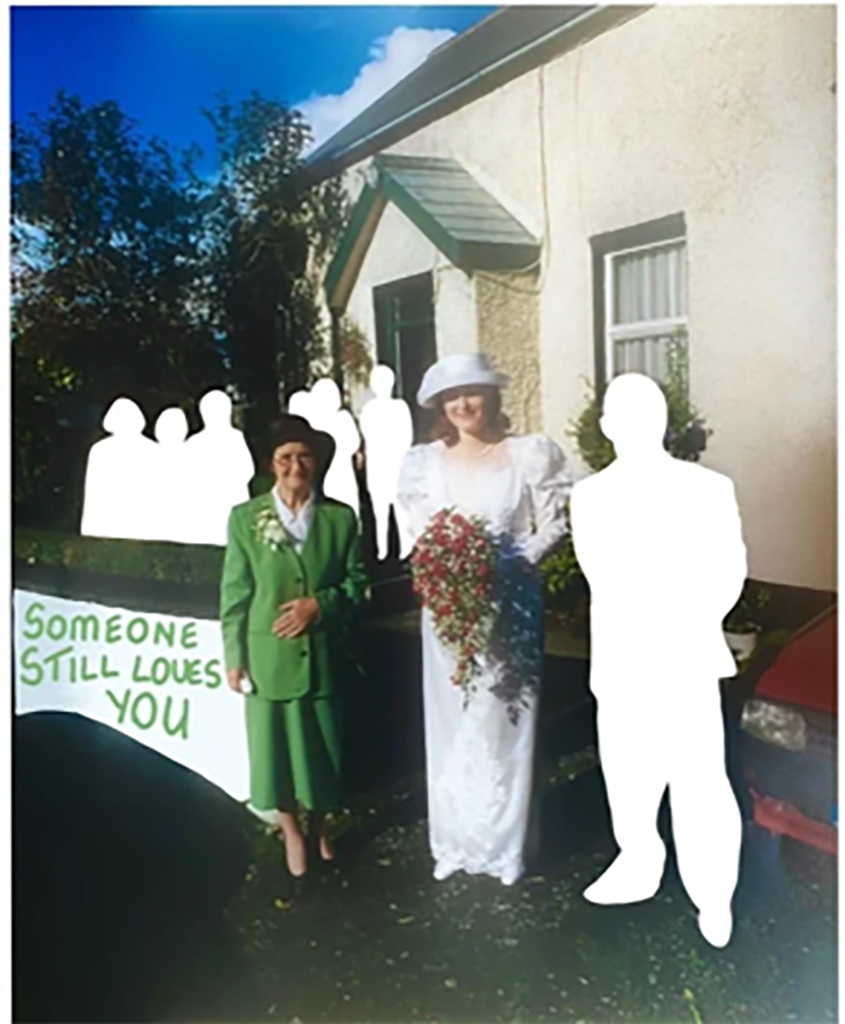 Starting with site visits to Shanakyle bog and Limerick Waterways, Rebecca found herself drawn to the abandonment of objects across the waterways and how nature overtook the abandoned Irish cottages by the bog. This put attention onto her grandmother’s house, which has stood as a testament to the beautiful life and love that once filled it. Reflecting on a poignant moment on the day she passed, where the turf in the range refused to light, Rebecca saw this as the house saying goodbye to her grandmother. Being unable to have a proper goodbye with her grandmother due to lockdowns, this project was an opportunity for her to provide family, friends, and strangers the chance to leave nothing unsaid with their lost loved ones. Using a mix of old and new family photographs, graphic illustrations and text; themes of reminiscence, memory, and our connection to others are explored. By blocking out the figure, it reminds the viewer of someone who has been removed from their life. The text brings to light the life that was once present and their importance in the lives of their loved ones. By blending these elements together, Rebecca portrays the versatility of nostalgia and grief through her practice