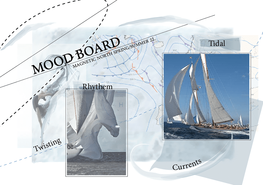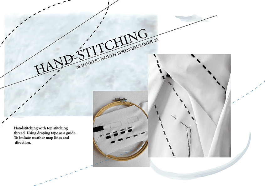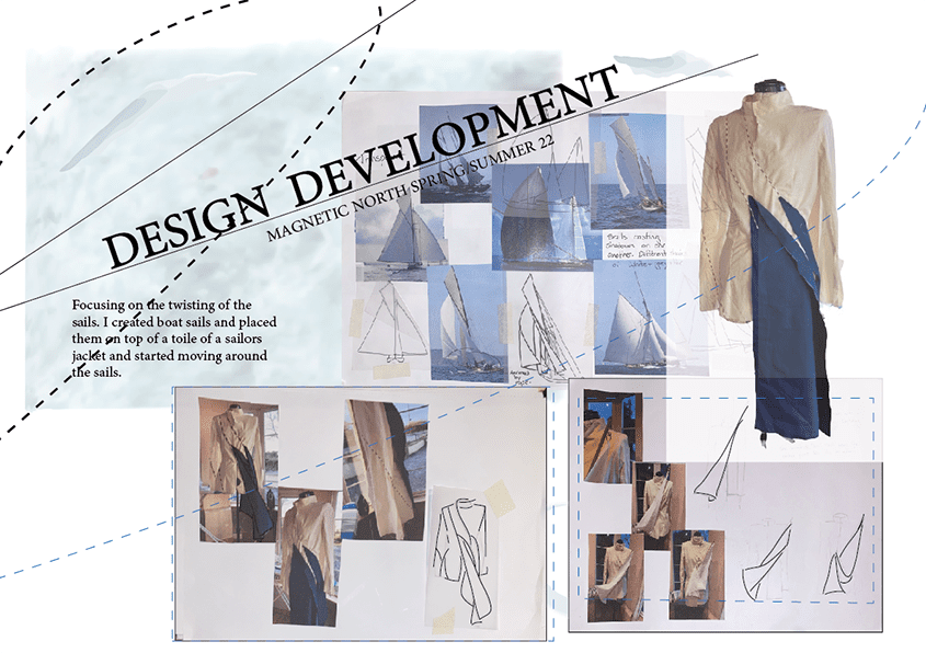 My final collection is about a sense of direction, inspired by the movement between the boat sails and changing wind patterns. The aim was to capture the romantic twisting and turning of the sails dancing in the wind. To achieve this, I worked with 3-dimensional drape in a variety of fabrics such as suiting and satin to emulate the reflective sheen of the sails against the choppy glistening water. Black dashed lines hand-stitched onto the finished garments, create a heightened sense of direction, giving the collection a sophisticated and graphic look.