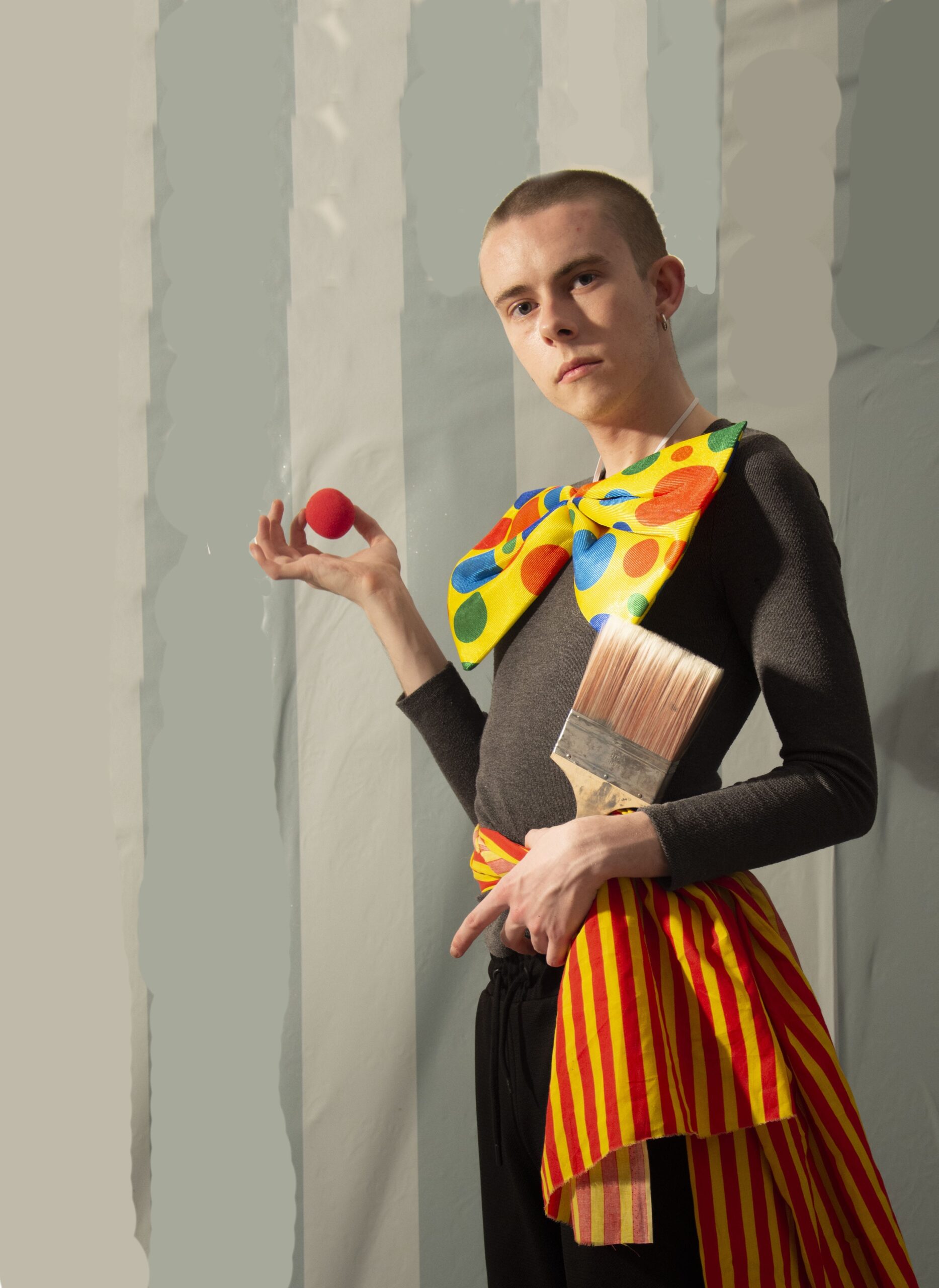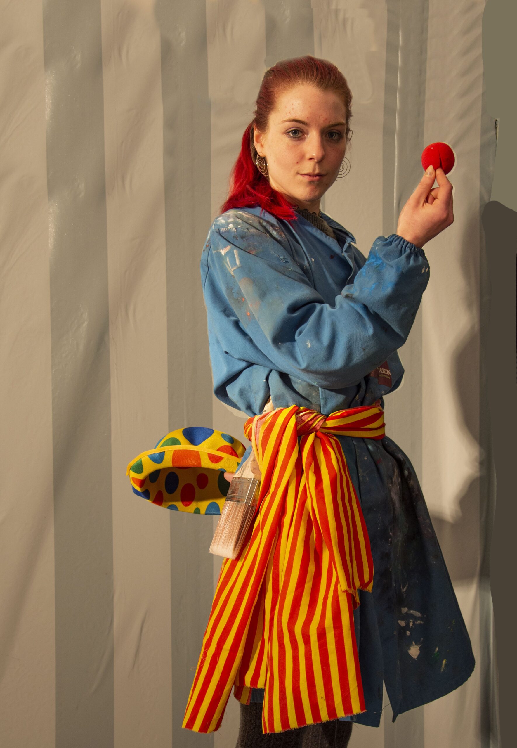 Robert Downey’s practice mainly focuses on figurative painting and deals with the issues of social commentary and artist identity.  His paintings open a painterly and conceptual dialogue between the dual role of subject and artist.  The subject of the painting is always the author, the artist regardless of the sitter.  models used are devises to portray the artists own feelings and emotions.  The idea of painting the model, is not to capture their personal aura and display it on canvas but for the artist to see themselves and personal views reflected back at them.  Being an artist in the modern era can be difficult especially for new artists.  Everything you do has been done before, the weight of art history stands on you and the pressure to innovate is constant.  It is therefore hard to create what you are interested in over what is considered new or contemporary.  As student artists we all share similar fears and frustrations.  Self-doubt can lead to one feeling foolish or another way to describe it is “feeling like a clown”.  You can feel foolish when venturing into the unknown, but it would also be ignorant to not be open to new learning experiences.