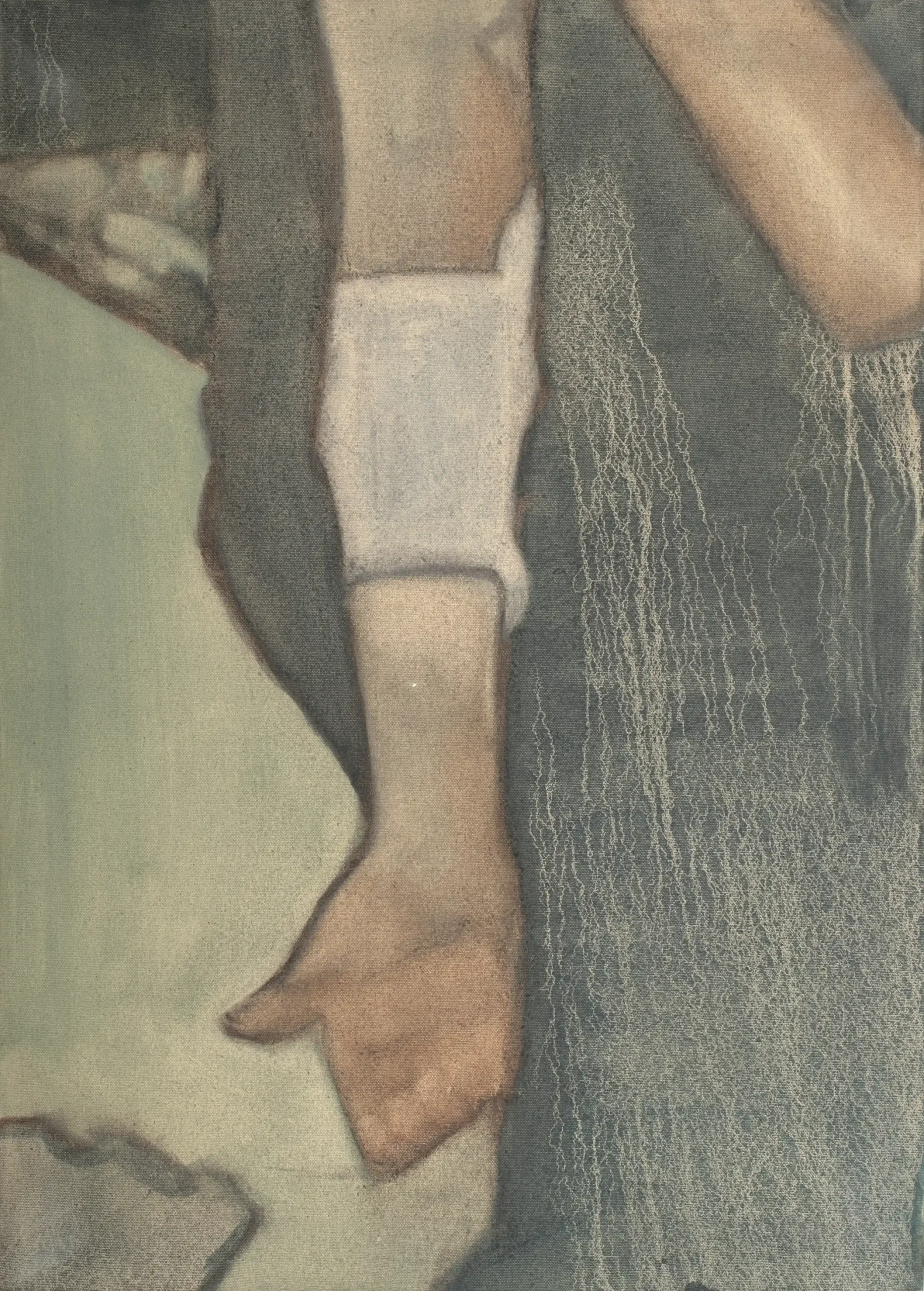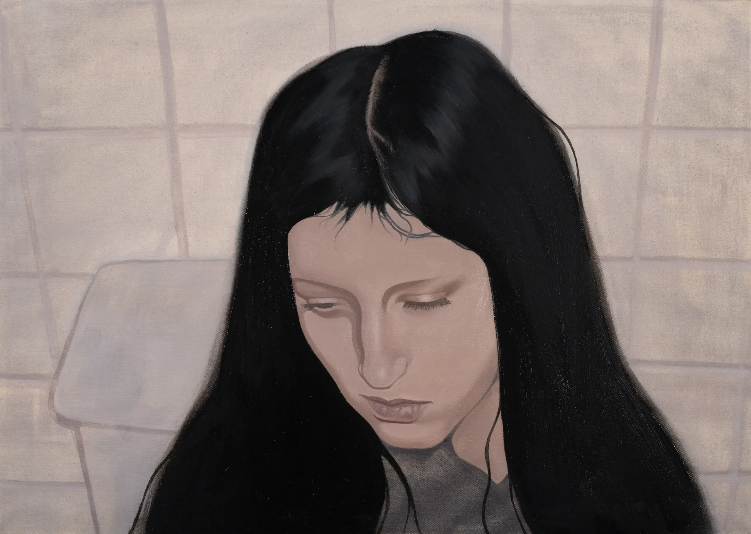 Using oil paint with solvent, he creates a blurred, grainy effect that mimics a low quality or overexposed photograph. His approach balances abstraction and detail, with some areas built up in thick layers while others remain stripped back. This interplay adds depth and intrigue, reflecting the transient nature of his subject matter.