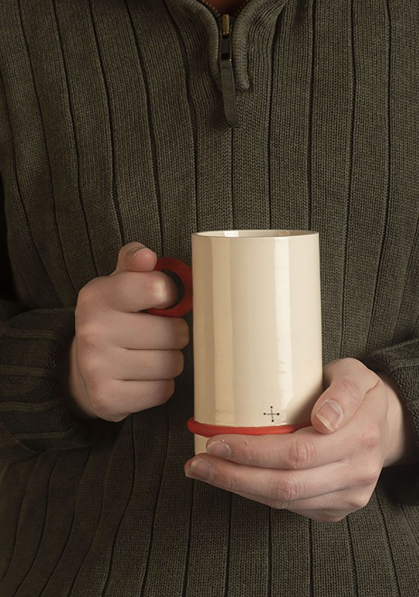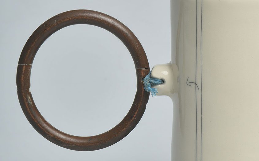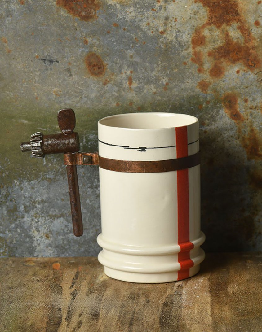 My work is a response to this curiosity, where the mug becomes a vehicle to explore notions of function through creating relationships between slip cast ceramic objects and eclectic man-made farm-yard finds. Scavenged elements are repurposed, their vital role on the farm conceded in considering domestic practicalities, while functional and aesthetic boundaries are pushed to pique the viewer’s curiosity. Reminiscent of the 2-dimensional diagrams and maps, grooves (colour), bands, shape, text and symbol infer how these mugs might relate and connect together, leaving room for imagination and play.