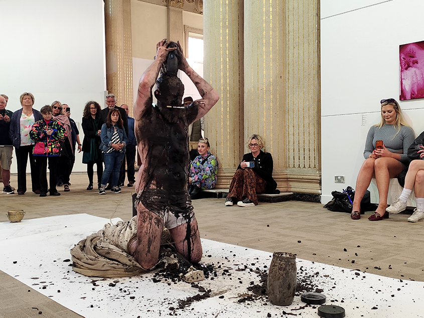Rocky’s Live Art Practice is firmly rooted in the areas of Time-Based Performance Art, Site – Specific and Responsive Performance, with a strong emphasis on Process Performance Drawing. Rocky works primarily in the mediums of live performance, moving image and drawing. Using a process-based performance methodology, Rocky’s live performance works enable him to use his body as architecture and infrastructure within specific environments. Presenting his body as material and a vessel for the embodiment of artifacts, gathering traces from the natural world, he uses his body as a tool implementing the dual processes of mapping and tracing the landscape. Rocky’s site responsive performances further explore this idea of the body as architecture, responding through performative actions, gestures, and movements to site, positioning the work within a contextual framework. He positions his body within internal architectural spaces immersing and engaging with structures and found objects as a form of human architecture.