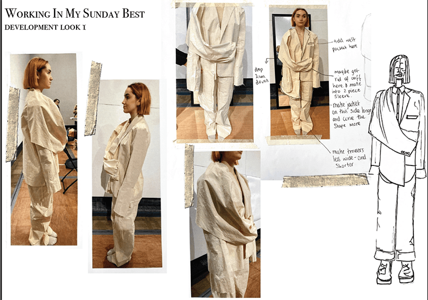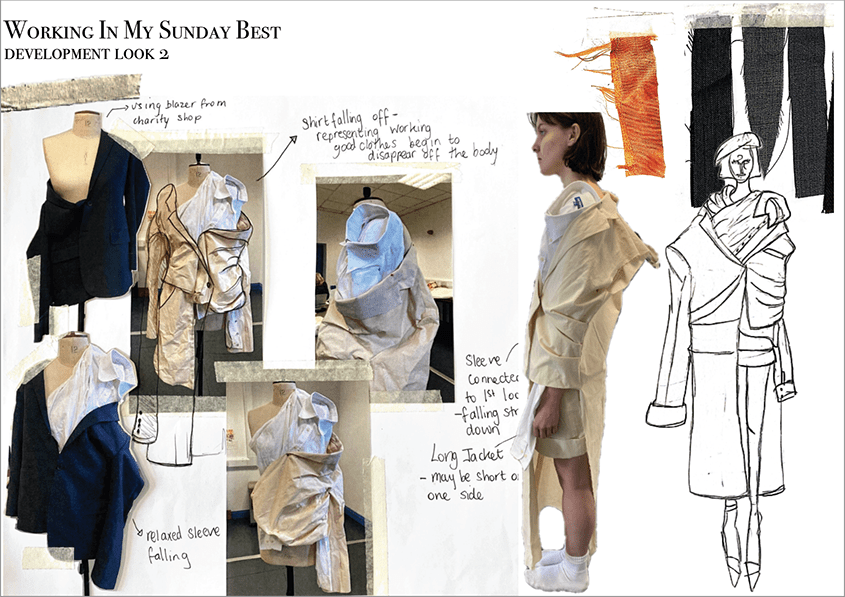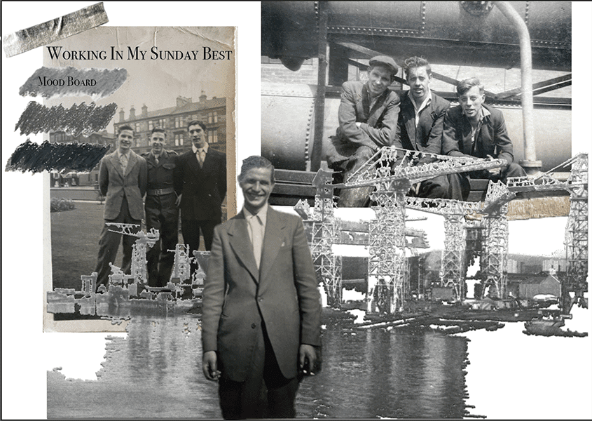 The inspiration for my collection stemmed from the admirable and hardworking life of my 91 year old grandfather. He grew up in Glasgow and had to leave school at a young age to start work. I wanted to surround my work around his career as a blacksmith when he worked on the shipyards. Growing up he would always tell me tales about his time on the shipyards. I began by looking through lots of old family photographs and online research. I initially focused on the body movements of the workers in the shipyards, which lead me to concentrate on what they were actually wearing and how these clothes functioned on the body, doing this type of work. I found the comparison of work clothes and “good wear” of the time really interesting, as both types were unique. I want this collection to inform nostalgic times whilst appreciating how working class people from this age dressed to impress. I hope my designs not only express the functionality of the clothes but also the beauty of them, and as well as a celebration of passed times.