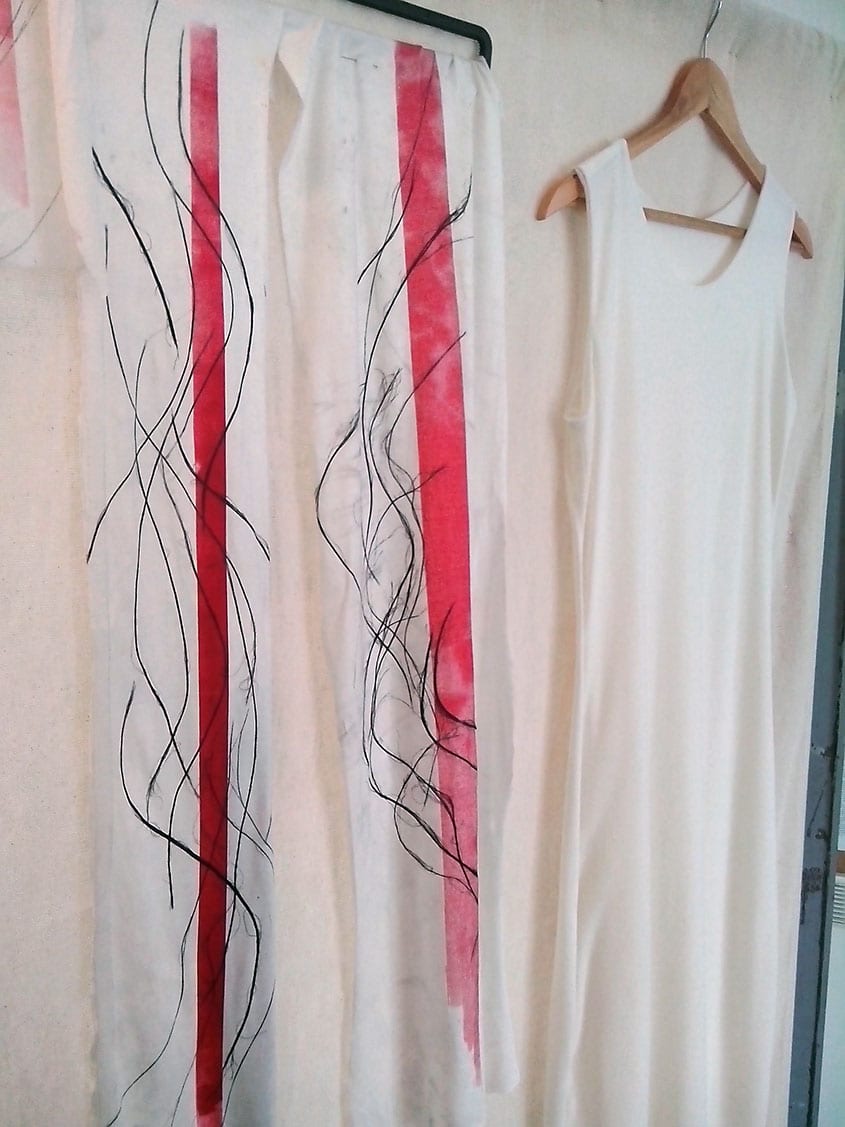 My Collection is based upon the traditional Japanese paintings of Taiso Yoshitoshi (1839-92) which I saw in the British Museum while on work placement during the summer. They depict haunting images of Onryo, spirits of those who died in tragic circumstances and return to haunt those who betrayed them in life. These spirits, usually portrayed with long black hair, were featured in Japanese artwork to convey overtones of vengeance and wrath.