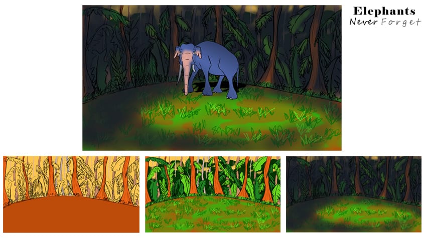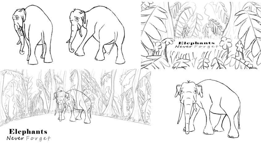 Elephants Never Forget is an animated short film that explores the topic of dementia and how it can affect individuals and those who care for them. The animation tells the story of an elephant wandering through the jungle alone. At first, this seems natural, however, the situation soon changes as confusion sets in. The audience experiences the world from the character’s point of view and what it is like to be in a familiar environment that is suddenly unrecognisable. As the character is isolated for most of the animation, the viewer also experiences the character’s vulnerability and how easily the character can misinterpret situations.
