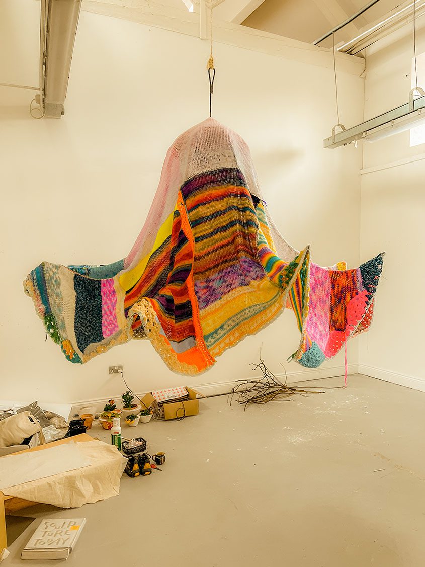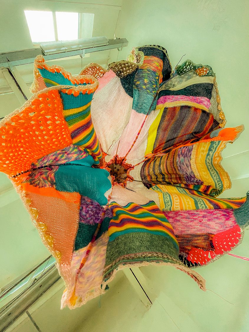 My art is inspired by and based on the idea of the balance between life and death, which a spider’s web symbolizes. The tent-shaped spiders of the genus Cyrtophora is the inspiration for my artwork.Spiders are the ideal representation of dualism in the physical world because they convey the strength of manifestation and creativity that is balanced by destruction. Due to its method of hunting, which involves weaving webs and waiting for prey to become entangled in them, the spider has come to represent patience and perseverance. I picked knitting and crocheting as my mediums because many cultures trace the invention of spinning, textile weaving, basket weaving, knotwork, and net creation to the spider’s ability to spin web.