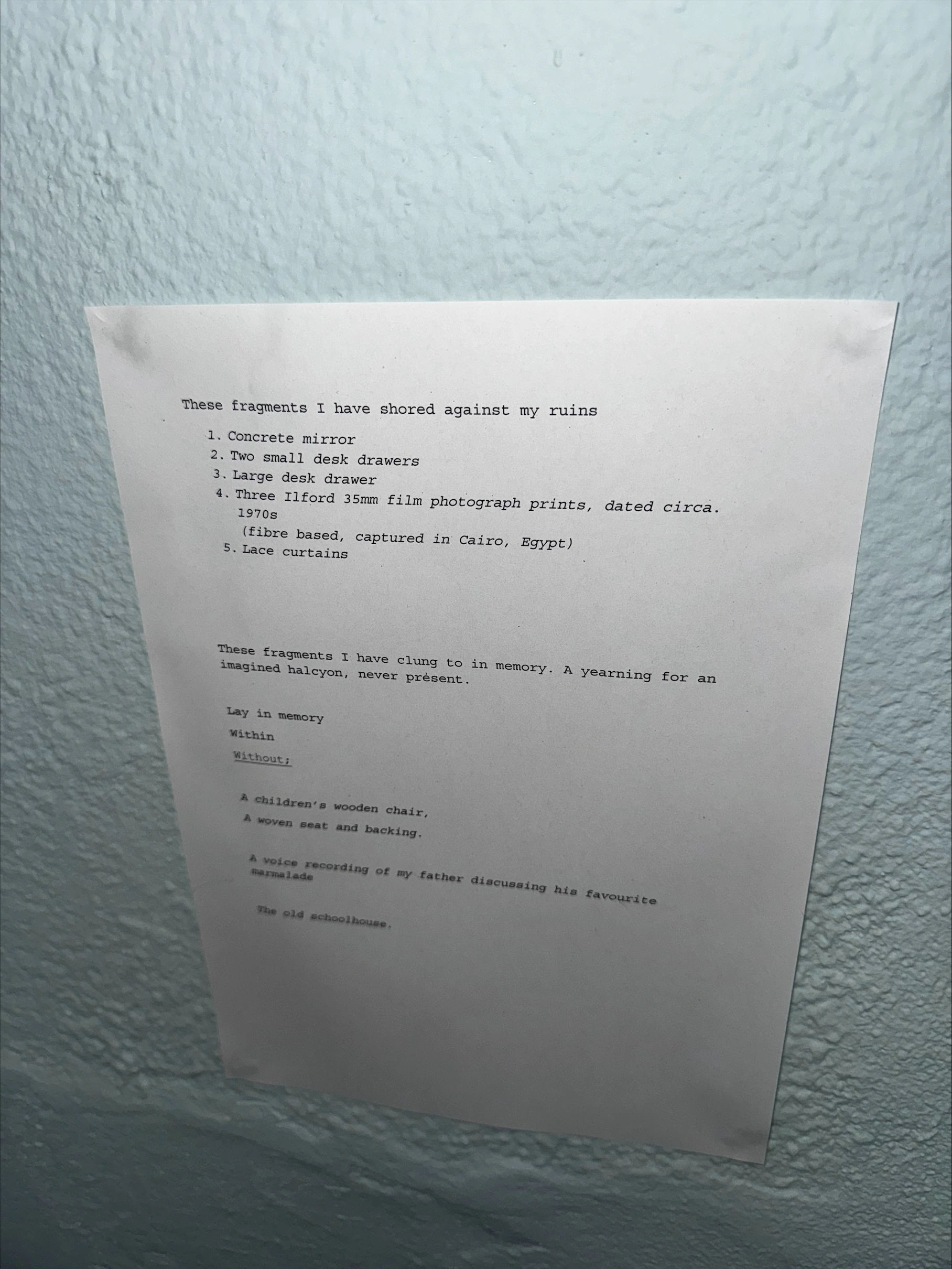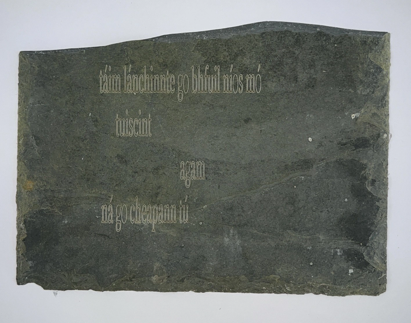 Reflecting upon the distant remembrance of vulnerable dialogues and conversations between family members, the piece utilises the materiality of roofing slate to immortalise fickle memories and conversations long past and almost forgotten..