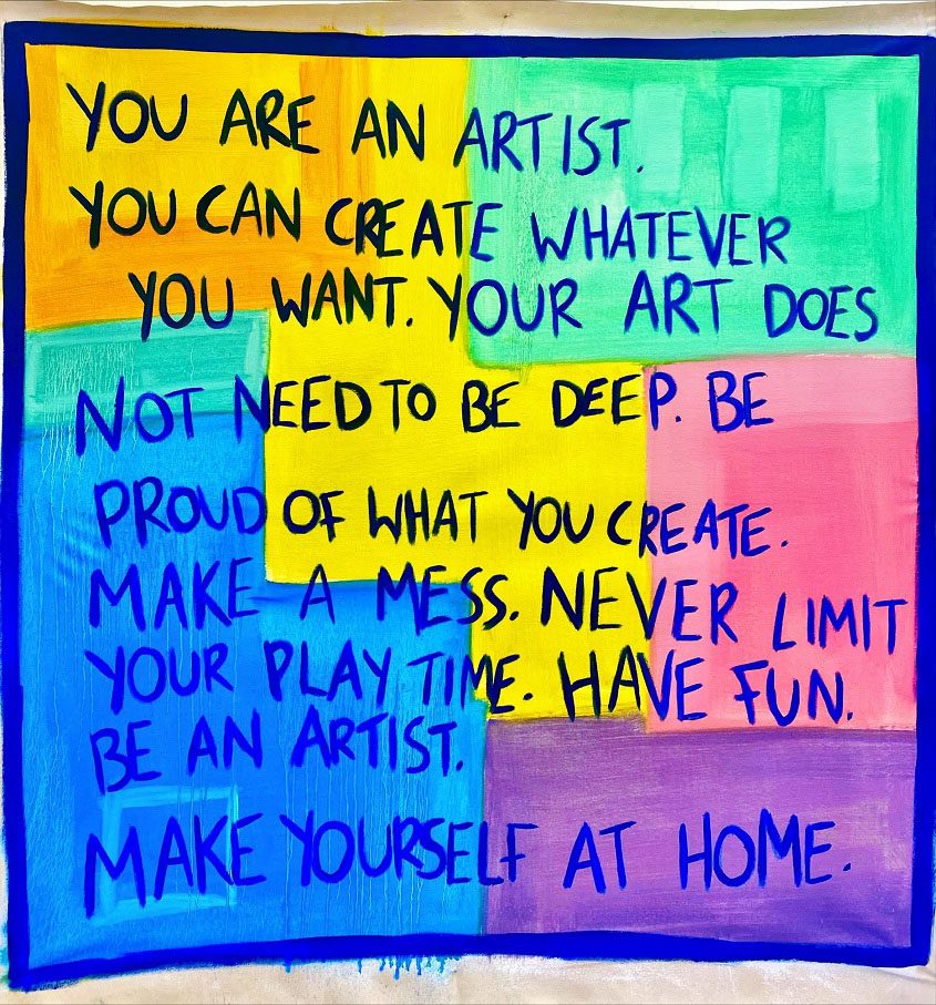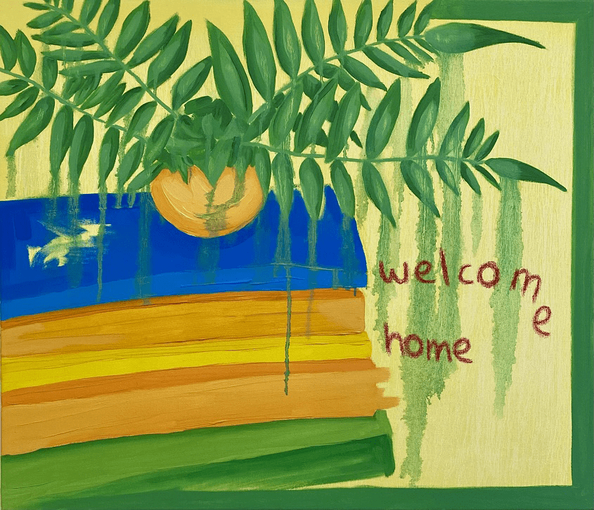 Her work is also inspired by the psychological and emotional dimensions of the home regarding comfort and discomfort. She is interested in exploring the ways in which the home can be both comforting and secure, as well as a source of anxiety, trauma, and isolation. By using colour and text to tap into these subconscious dimensions of the home, she creates a world that provokes reflection and introspection, inviting viewers to explore their own experiences of the liminal spaces in their lives.