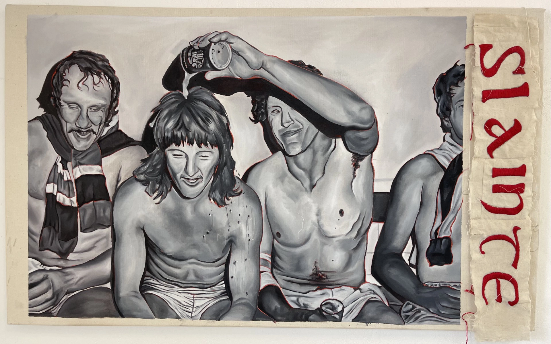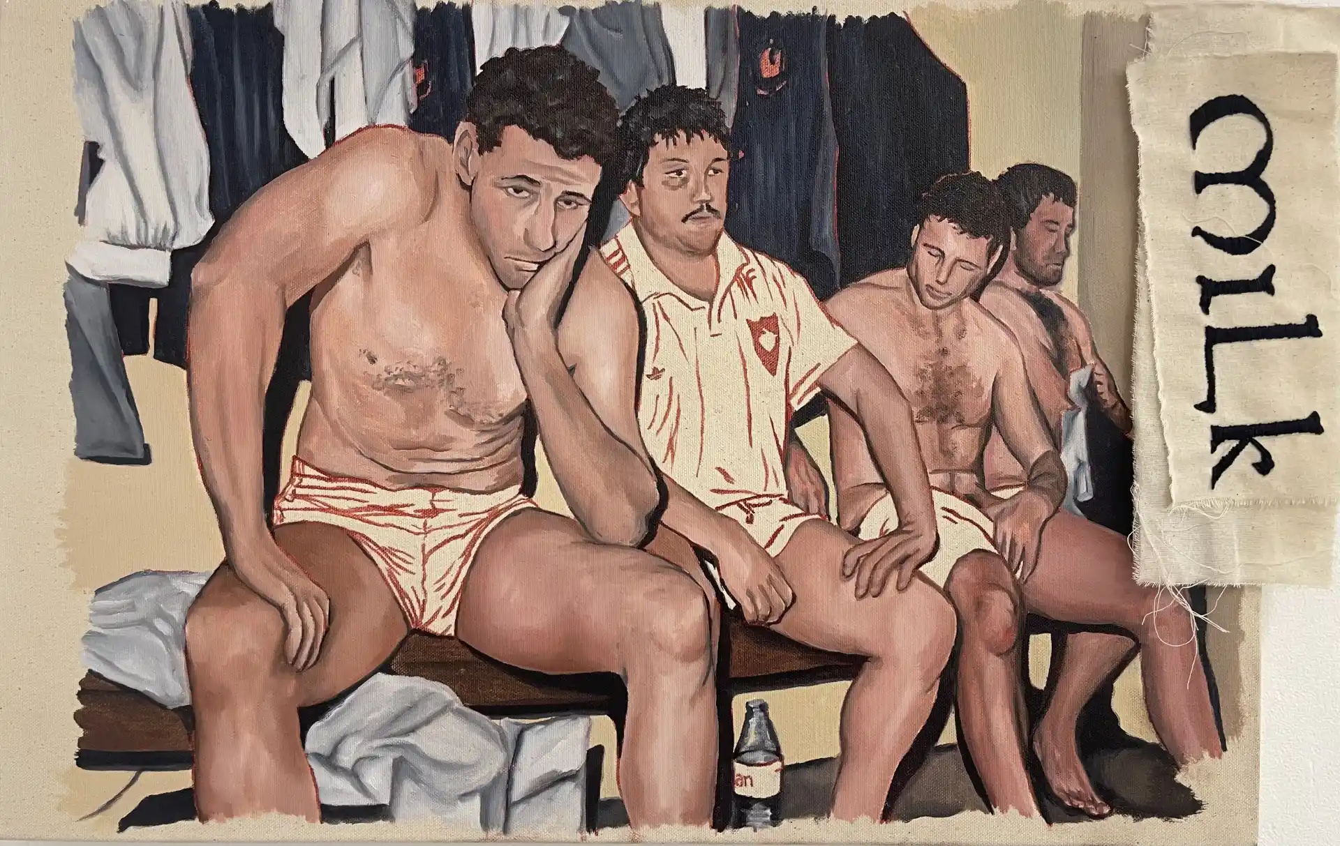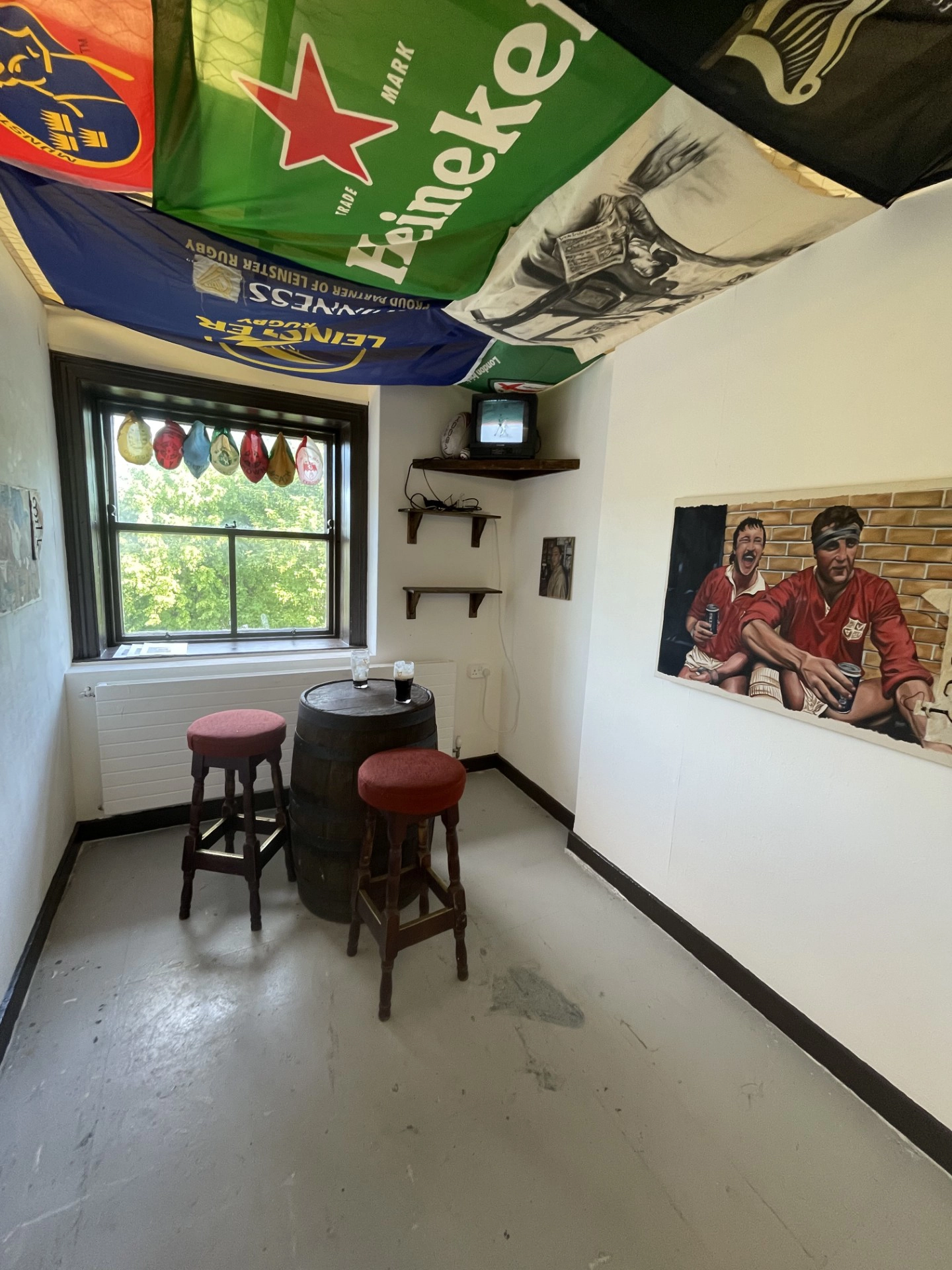 The inclusion of objects like the pints, rugby flags, and television footage layered with ambient pub audio serves to root the paintings in a lived, multisensory context. While my paintings often focus on the male dressing room as a site of vulnerability and unspoken tension, their placement within this domestic-pub setting underlines the cultural continuity between sporting spaces and pub spaces — both shaped by performative masculinity and exclusionary norms.