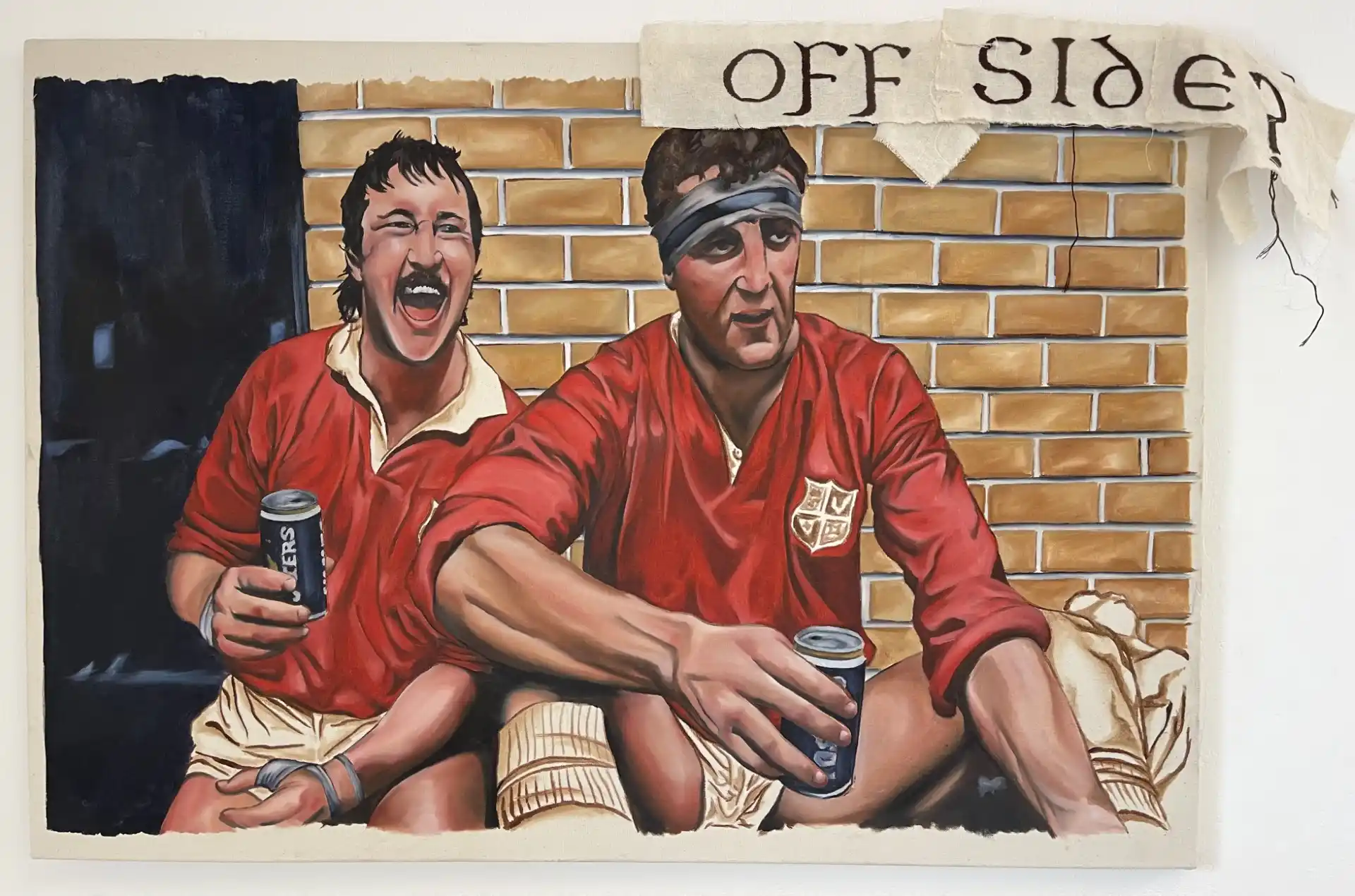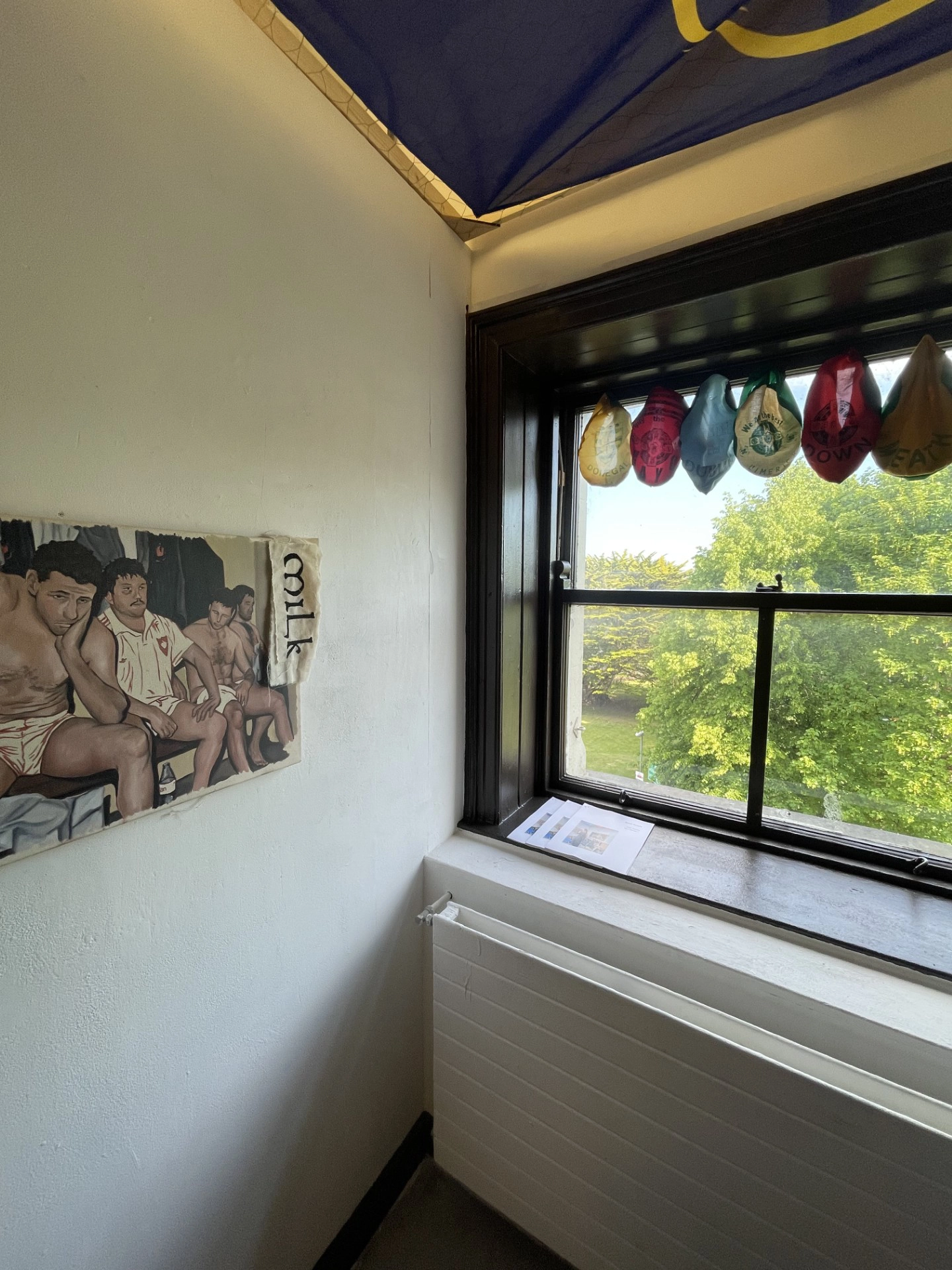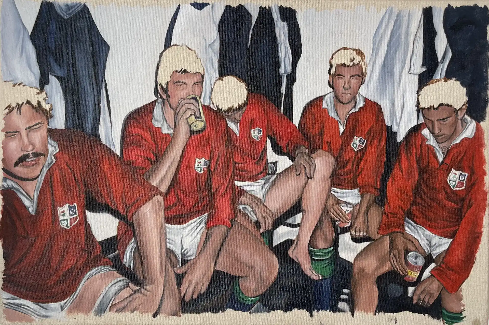 The inclusion of objects like the pints, rugby flags, and television footage layered with ambient pub audio serves to root the paintings in a lived, multisensory context. While my paintings often focus on the male dressing room as a site of vulnerability and unspoken tension, their placement within this domestic-pub setting underlines the cultural continuity between sporting spaces and pub spaces — both shaped by performative masculinity and exclusionary norms.