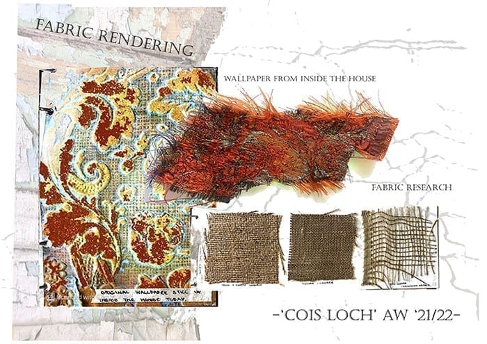 I began by meeting with the restoration architect of the house Wendy Lyons, who kindly gave me copies of her hand-drawn architectural drawing of the house and its layout. I used these to collage with, I then blew them up and worked with them directly on the stand, to create the bold outset structure of the garments. Working from flat collage to 3D on the stand allowed me to create an androgynous collection. The harsh line of the building contrasts and compliments the softer deterioration aspects of the collection.