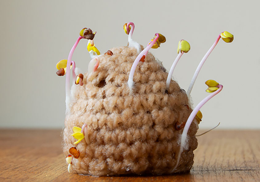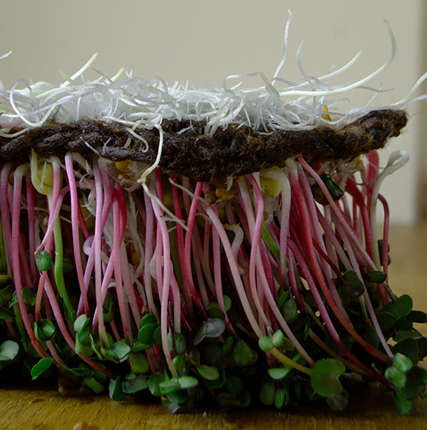 Sarah’s practice is rooted in the ritual of daily walks and slow looking, desiring to explore the endless threads of connections between ecology and visual art. She is interested in collaborating directly with the natural world. Currently she is interested in facilitating creative exchanges between Plants and Fungi while exploring ideas of distributed authorship. Greenhouse Studio is a grow-house of collaborative experiments. Within a greenhouse which is handcrafted using timber and repurposed windows, a collection of living sculptural work grows from seed to shoot; from spawn to mushroom. Greenhouse Studio uses substrates such as cardboard, sawdust and wool as catalysts for new growth. Weaving connections – literal and poetic – between these materials, allows artist to become mediator, and material to become collaborator, underpinning the rhizomatic nature of creation.