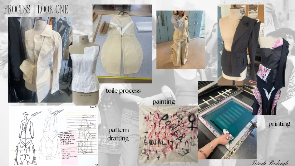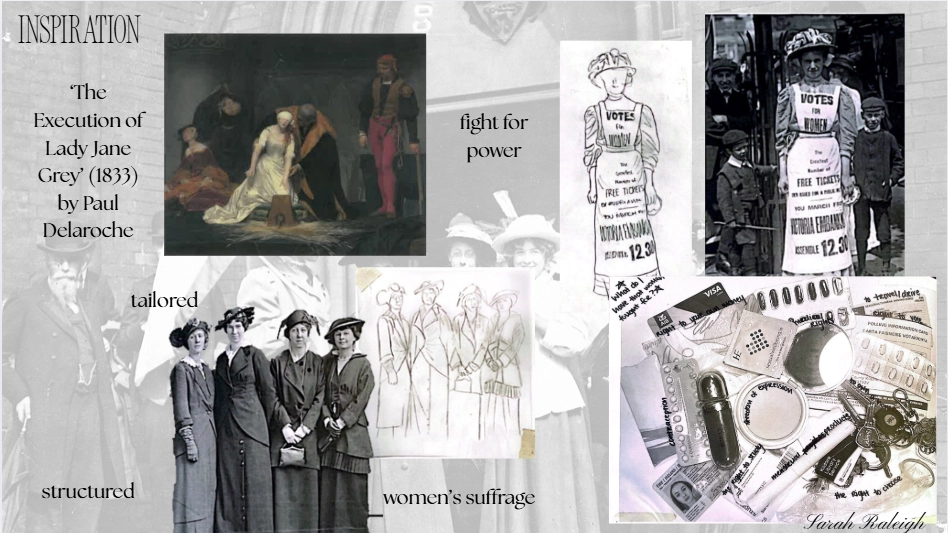 The concept for my graduate collection is derived from my ongoing appreciation for the feminist movement, due in part to the influence of my predominantly female family. This comes at a crucial time in society, as general elections in many countries, including ours, see female candidates for higher office as a real possibility. However, many have not been successful. Can we say that, as a world, men and women are equal when these injustices persist?