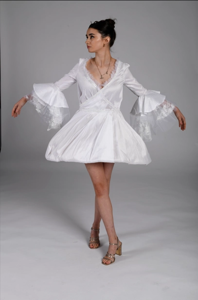 Through the combination of drape, pattern cutting and an innovative cut, I will create a collection with a tailored, structured silhouette. Fabrics such as duchess satin, lace, denim, and men’s suiting materials create a clean and crisp collection with a muted colour story of white, black, and grey, with hints of pink to bring in a sense of femininity. I have elevated the chosen fabrics with contemporary and unique fabric treatments such as screen printing and deconstruction.