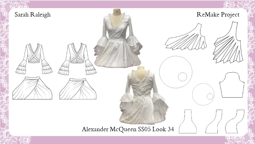 Our first garment, created in Fourth Year, is a part of our Pattern Drafting and Garment Construction classes. In the Remake Project, we are all required to choose a look from the collection of another designer. Alexander McQueen has always been one of my favourite designers, specifically for his work in tailoring, but also for his way of draping and use of the human form. I chose my look for this project based on the need for both 2D and 3D work; flat pattern drafting was only half the job, as draping on the mannequin and readjusting accordingly completed the look. I also chose it for its structured nature, wanting to explore engineering more complex garments with a more defined shape, whereas previously I had worked with softer, more vague shapes.