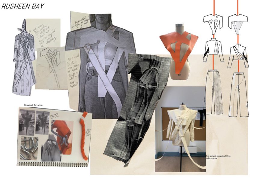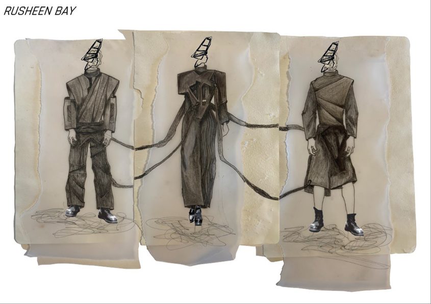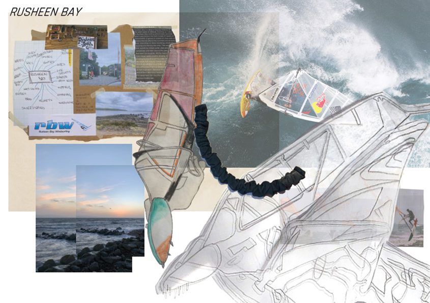 This collection was inspired by Rusheen Bay, a beautiful area located in Co. Galway. The bay is important to me as it is where I spent summers as a child. Not only is it a picturesque landscape filled with luscious textures and vibrant colours, but there is also a windsurfing school located there that my sister and I attended every summer. Out of all the positive memories I have of Rusheen Bay the one that resonates most is the relaxed and peaceful atmosphere created there year after year. In my collection I hoped to capture this atmosphere through soft textiles and loose textures filled with movement. Taking the concept of directional change, I experimented with pattern drafting to create pieces that imitate the changing angles of a windsurf as it glides through the water. I then tested various fabric manipulation techniques to build a texture that replicated the movement of waves. In keeping with the theme of shifting directions I decided to connect my three looks with strapping and snap hooks that can be rearranged to change the shape and spec of my collection.