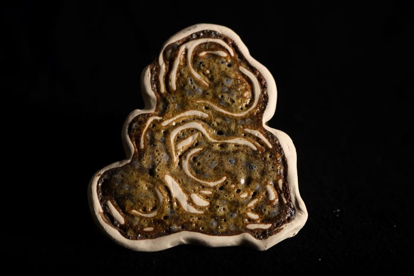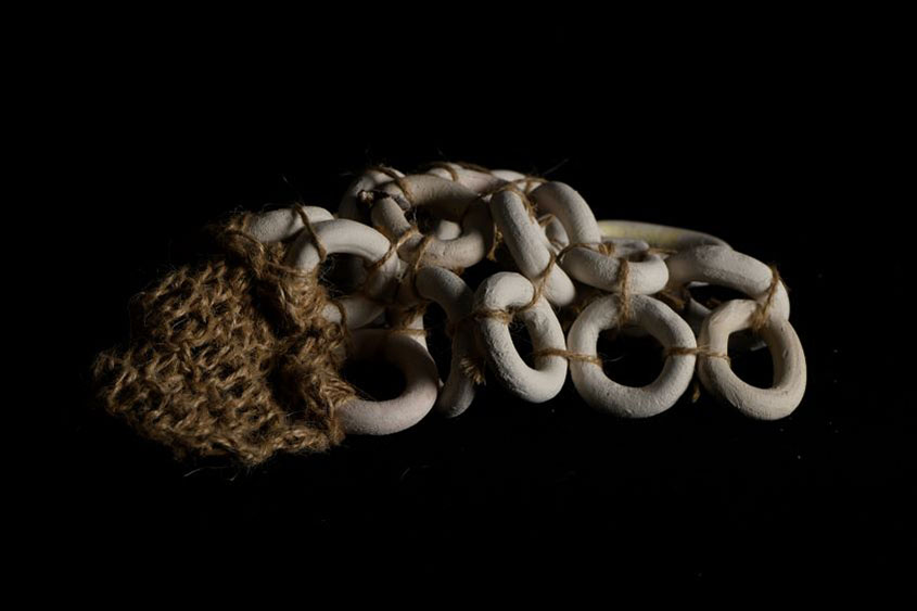 This work explores the duality of addiction—the warmth and support it offers, alongside the negativity and dependence it fosters. The act of weaving, sewing, wrapping, and twisting echoes the complex nature of this relationship with addiction. Through this comforting blanket I weave together the emotions and experiences that surround my struggles with behavioural addiction. The juxtaposition of a range of materials serves to embody the intricate relationship between myself and addiction. The white stoneware symbolizes my essence, while the stains of black represents the persona of addiction.