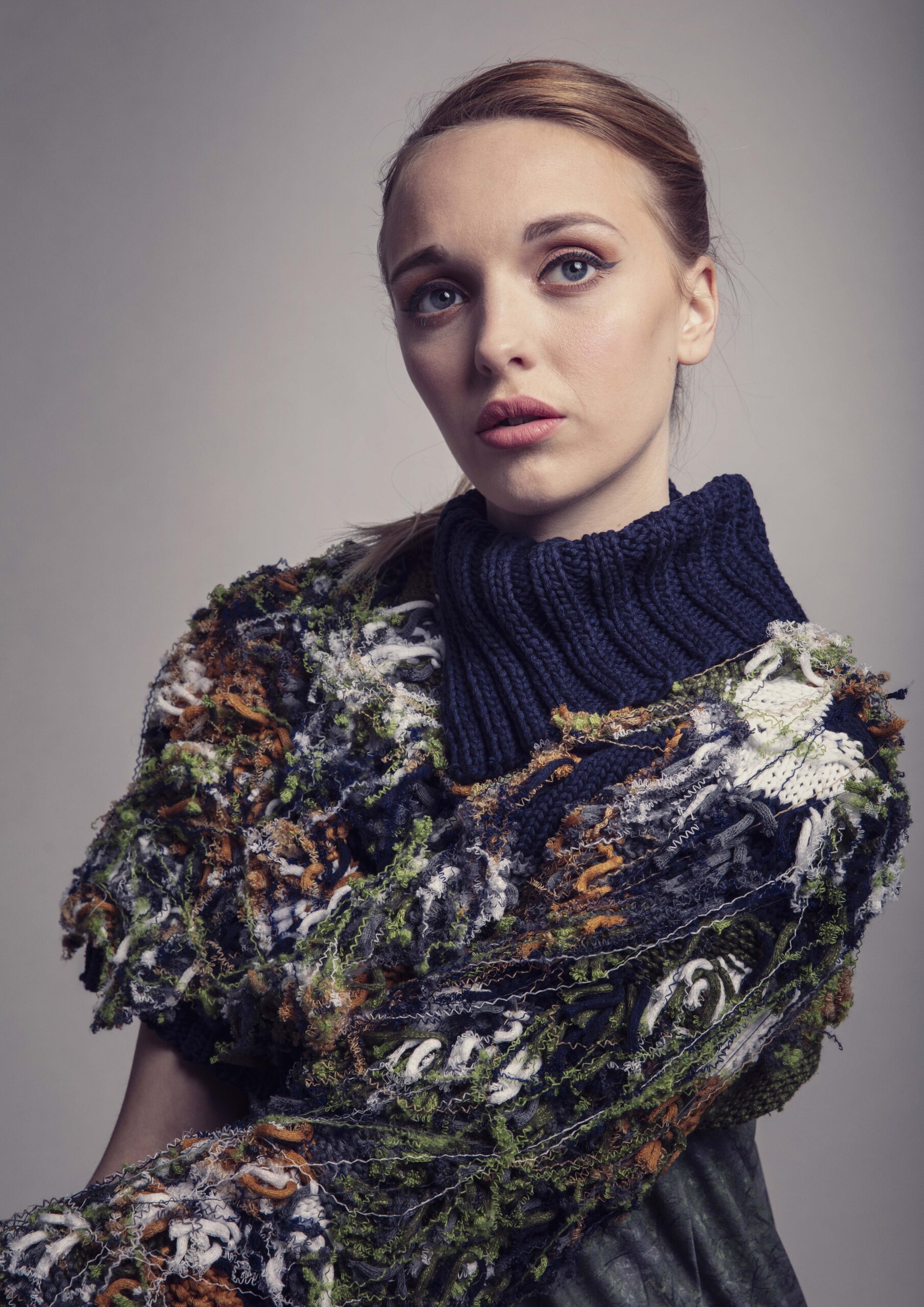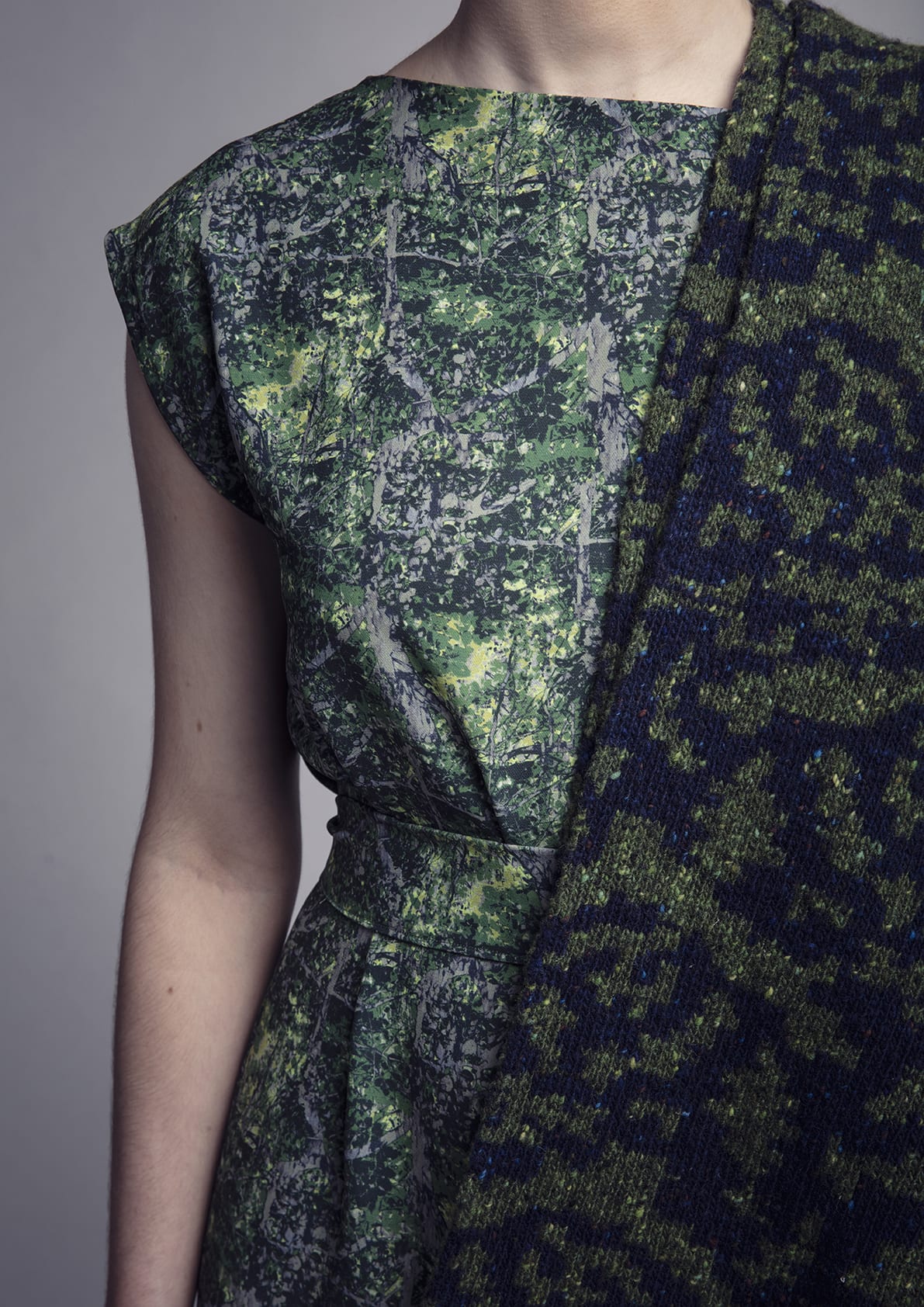 My final year collection is inspired by the west of Irelands landscape and nature. I took photos in a woods called Belleek Woods near my home in Ballina, Co. Mayo. I used these photos to develop my own printed surface design fabrics which I worked with the photos through Adobe Photoshop to create my own designs .I am inspired by Irish heritage and crafts- I incorporated the craft of hand knitting into this collection working with yarn that is made from recycled Polyester which supports my theme of slow fashion and sustainability. The materials I used in this collection are important to my concept. The Irish company Donegal Yarns kindly sponsored me yarn for my collection. Using this yarn on the Shima, an industrial recognised machinery to create my knitted fabric using Aran stitches to create my own twist on contemporary Irish knitwear.