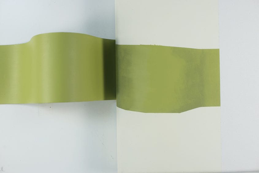 The work is concentrated on progressing out of the frame, utilising the surrounding space. Painted movements begin to expand outside of the canvas and onto the wall of the space. Works are produced in a site-specific manner and therefore relate to the architectural fabric of the space. The process of constructing the work considers the nature of scale, colour, and materiality in relation to the space.