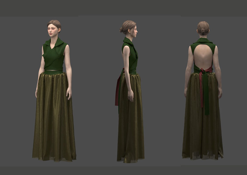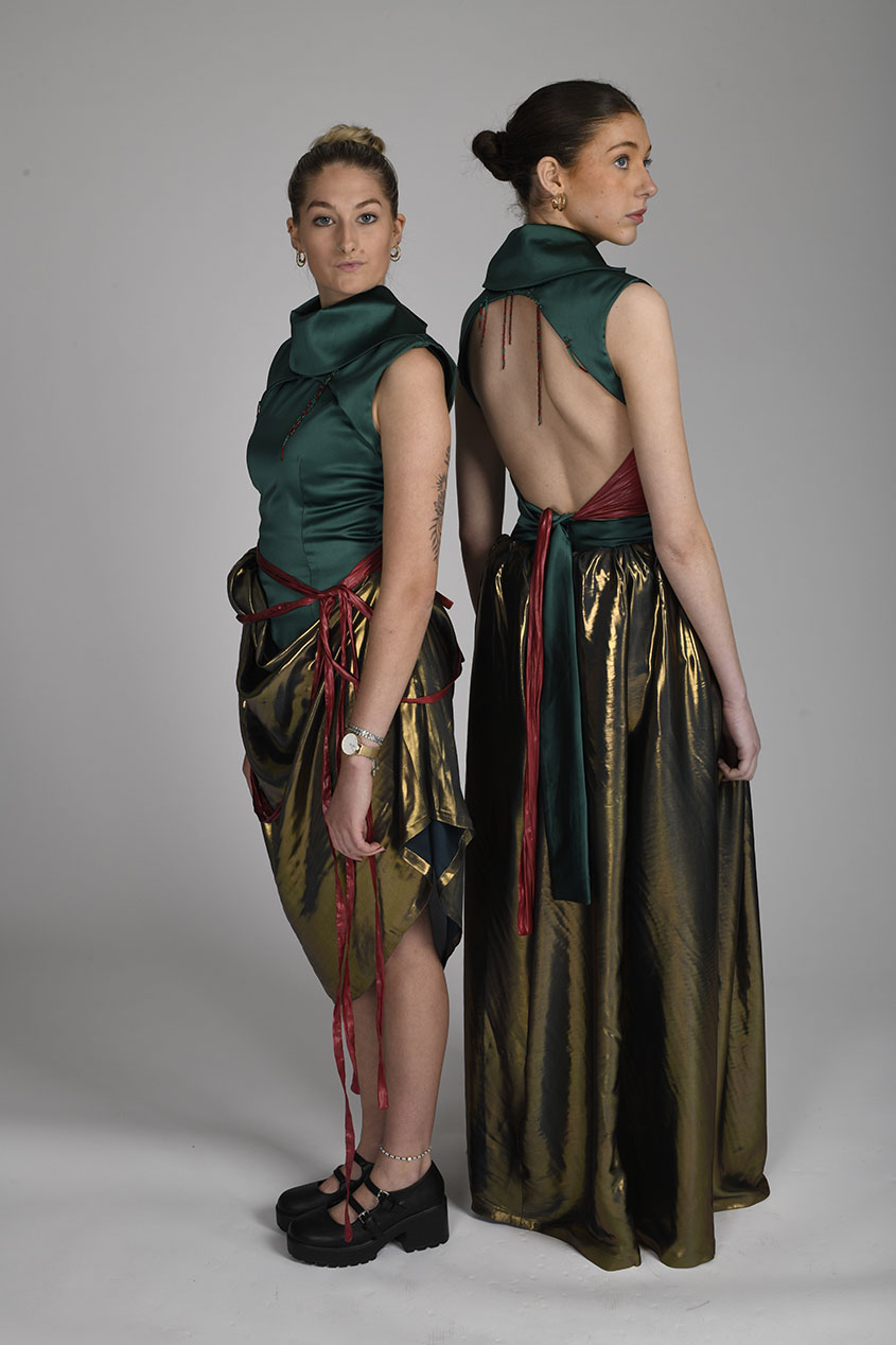 The collection explores the medical abuse endured by women diagnosed with hysteria, incorporating elements of straitjackets and 18th- and 19th-century medical coats. Fabrics like green satin and gold-coated chiffon convey emotional intensity. The deep green, inspired by Bacon’s work, symbolizes diseased minds, while the chiffon’s draping evokes emotions pouring out. This narrative reflects on the historical oppression of women under the guise of medical treatment, celebrating their resilience in the face of adversity.