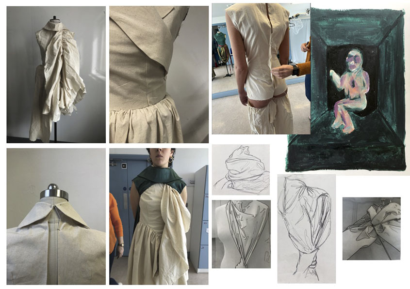 My collection draws from the historical diagnosis of “hysteria,” once a common label for disorders like bipolar and post-partum depression. Symptoms like anxiety, irritability and sexual desire were associated with this diagnosis, reflecting societal attitudes toward women’s mental health. Inspired by Salvador Dalí and Francis Bacon’s depictions of mentally unstable women, my designs aim to capture the chaos and turmoil experienced by those diagnosed with hysteria. Shapes are abstract and moody, echoing the emotional complexity of the subject matter.